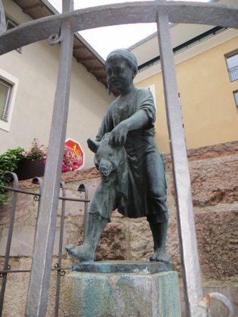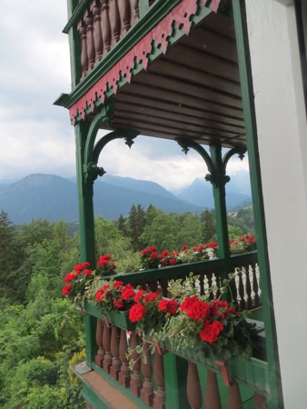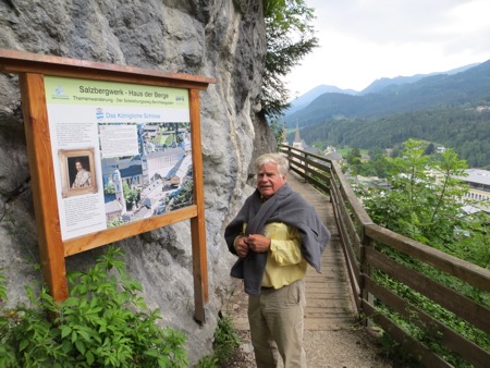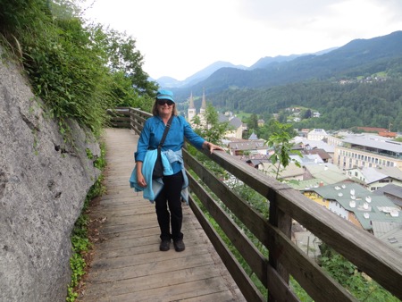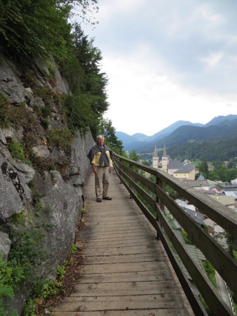 We returned to our chalet style hotel and checked in. We have our little porch with geraniums and plan to eat in the hotel restaurant. We did venture into town and did some window shopping. We even found the elevated and cantilevered salt mine trail that periodically collapses and dooms those who dare to walk on it. It was perfect for Peggy. After the trail were in need of some wine.