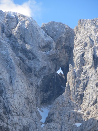 The drive was dramatic to state it mildly. We managed to pull off to take a couple hundred pictures while dodging bikes, motorcyclists, tour buses and other sightseeing cars. It wasn’t too bad. As we reached turn 16 we saw the hole in the mountain that is big enough for the Statue of Liberty. You look right through to the sky on the other side. As we reached the top, we could see Mt. Triglav which has the same meaning as Half Dome for Californians. It is on their half Euro coin.