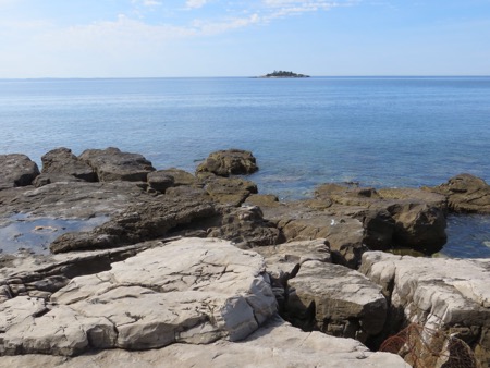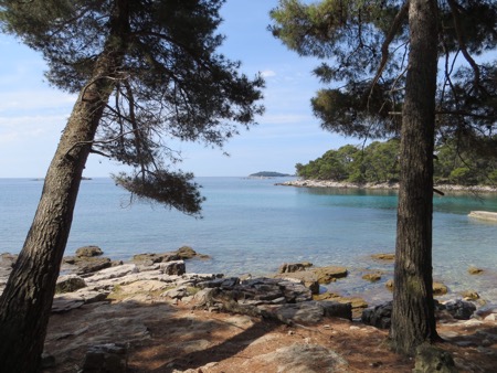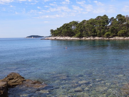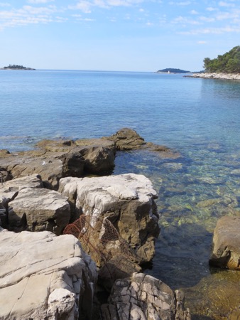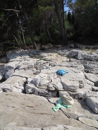 We brought “Crocs” for shared showers and a beach like this. You entered the high 70 degree water and immersed yourself by walking over craggy rocks and barnacles. It was actually fine and the water is amazingly clear. The scenic setting gradually added visitors as the morning wore on. Even though the SPS 50 sunscreen had been applied. Neither of us wanted too much time in the sun.