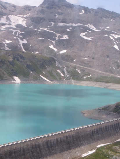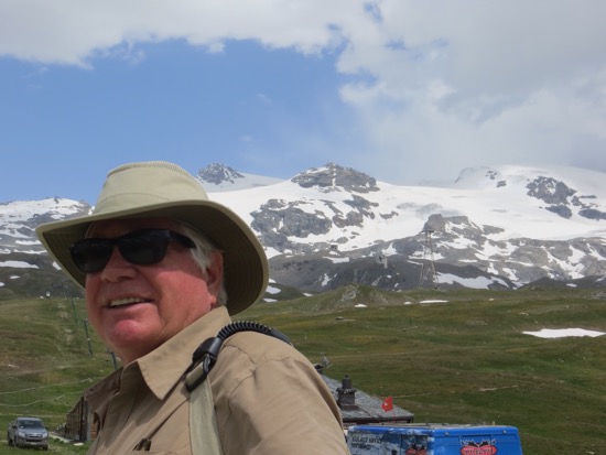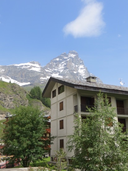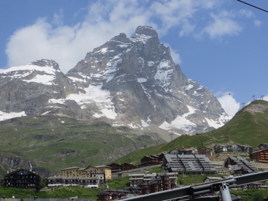 Plenty of crazies with their bikes to careen down the hills. Didn’t see any bike accidents. After returning to the village of Brueil where we are staying, we witnessed a rescue helicopter taking a climber off the Matterhorn. We were watching as an avalanche took place near the top. One of the local spectators explained that this is a dangerous time of the year to be climbing as the ice and snow are melting. Since the mountain is largely shale it is soft and crumbly. Granite like the Sierra Nevadas is much safer to climb with the proper equipment and skill levels.