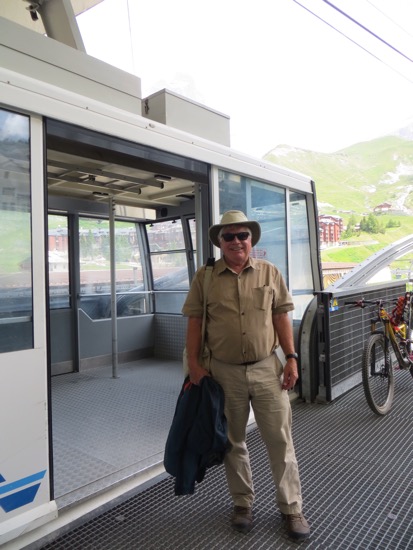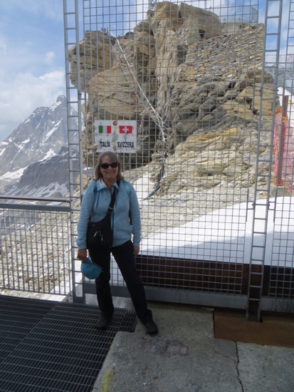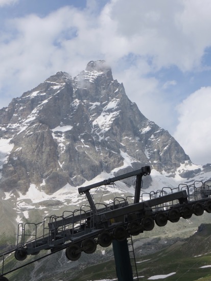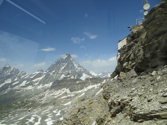 The weather forecast called for afternoon thunderstorms a top the Matterhorn. We left Bergamo hoping that we could get there in time to at least see the mountain. We arrived by noon to bright sunshine. Knowing that things can change quickly in the mountains, we checked in and hustled to the rope cable. That doesn’t sound too safe but I knew it was term that we would apply to gondolas on cables.