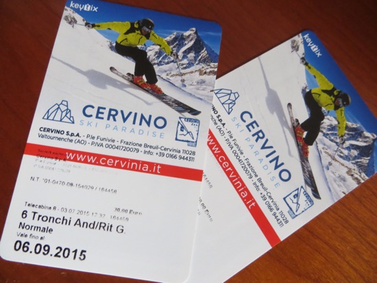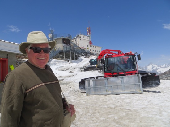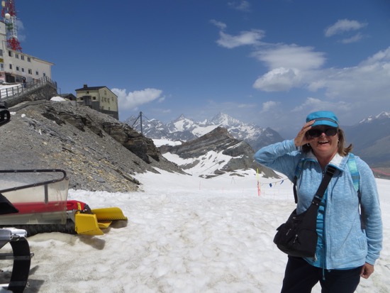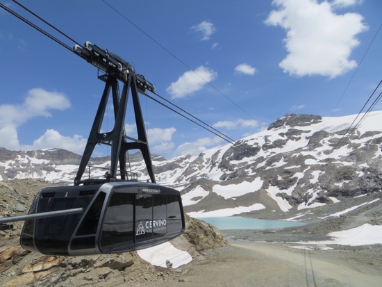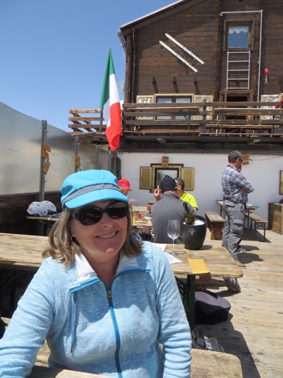 It took 45 minutes to ride three different cars to the Plateau Rosa at 3500 meters. It is as high and as close to Cervina as you can get without climbing it. Cervina was in full view the entire time. On top we joked with the gal at the “Refuge” for a beer and a sandwich. We told her that we brought some California sun. People are still skiing on top of the mountain although the conditions didn’t look great.