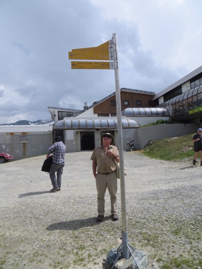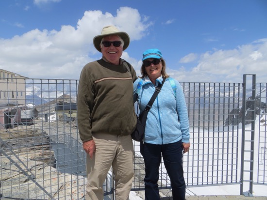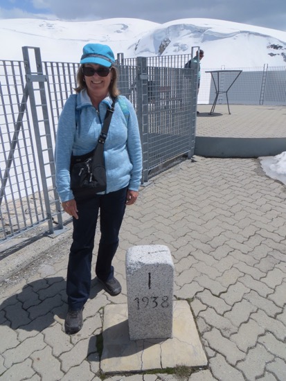 The lift ends at the Swiss border. We found an actual corner that was placed in 1938. Peggy hammed it up. They also have yellow paint on concrete that lies on top of the border. Of course, her family still insists that they come from the Italian side of Switzerland. We covered all the bases while on top. We got plenty of pictures. We were somewhat embarrassed to see many of our age peers walking down the mountain. It didn’t look too tough, but we didn’t need to throw a knee at this point in the trip.