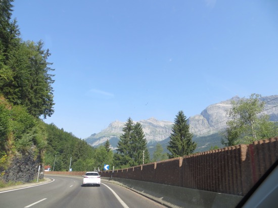 We went through a half dozen two or three kilometers in length. We headed towards Monte Bianca or Mont Blanc in French. We went through a complex series of gates and entries, paid our hefty toll and entered the 12 kilometer tunnel that goes under Europe’s highest mountain. I was expecting to get loaded on a train but we just drove in a tightly regulated way through the nearly endless tunnel. When we emerged we were treated to the valley of Chamonix and a stunning glacier next to the highway. We were in France. The tunnels were mostly behind us.