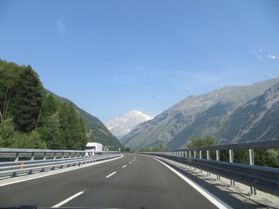 The Matterhorn shown brightly as we awoke in our mountain refuge from the summer heat. A full breakfast and we were on our way down the 30 kilometer twisting road through scenic Alpine villages and a few crazy Italiam drivers. We reached the freeway and enjoyed a peaceful drive through the Aosta region. We finally ran out of easy terrain and entered the land of tunnels. We could ha voided the big tunnels by going over St. Bernard Pass. Peggy knew that if we went that way that we might have a rapidly growing puppy with us. Goldie would be too jealous.