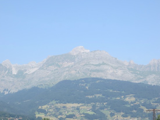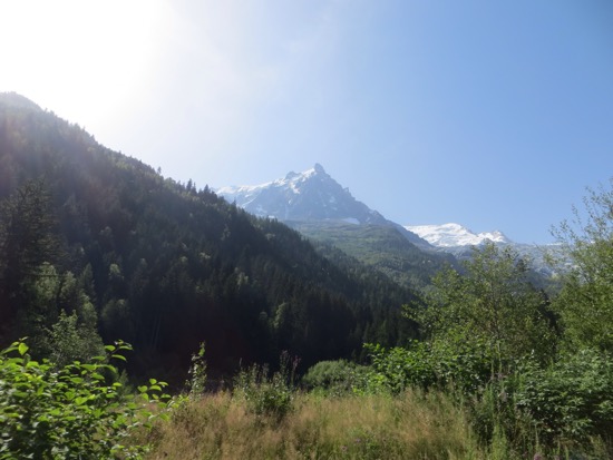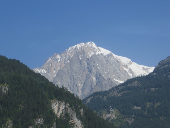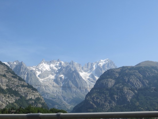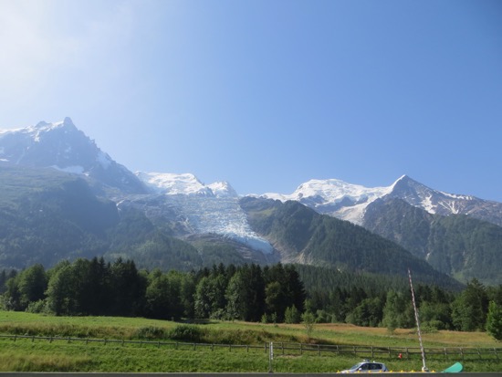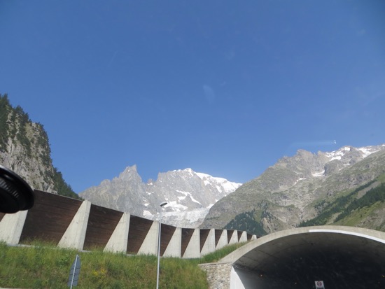 We went through a half dozen two or three kilometers in length. We headed towards Monte Bianca or Mont Blanc in French. We went through a complex series of gates and entries, paid our hefty toll and entered the 12 kilometer tunnel that goes under Europe’s highest mountain. I was expecting to get loaded on a train but we just drove in a tightly regulated way through the nearly endless tunnel. When we emerged we were treated to the valley of Chamonix and a stunning glacier next to the highway. We were in France. The tunnels were mostly behind us.