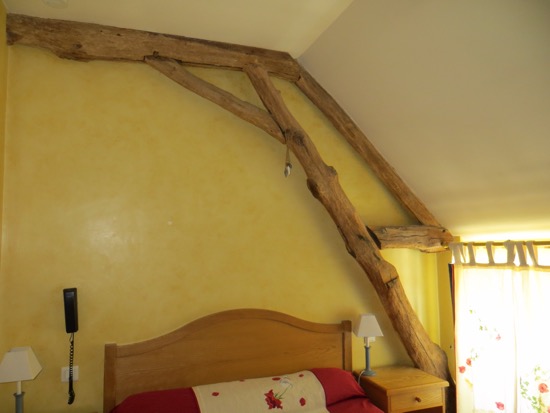 The room is held up by 600 year old tree branches. We have a en suite shower and toilette and a 10 inch TV. No AC but a big fan. We had a cheese and salad plate with a glass of the local Pommard wine. It was great with the bread that only the French can make. The wife of the proprietor’s father is a winemaker down the street about 50 meters away.