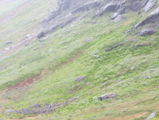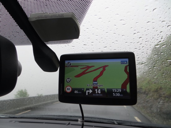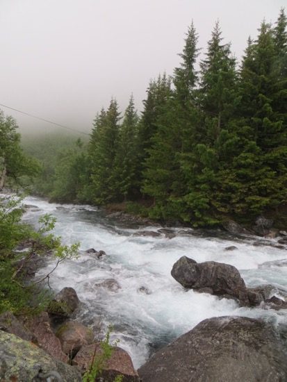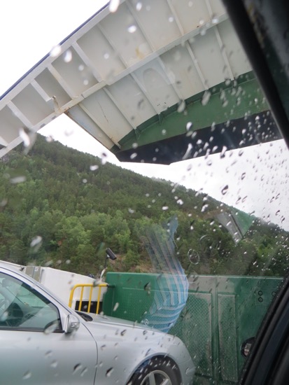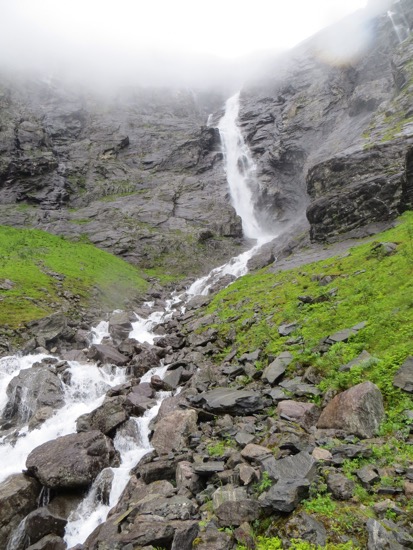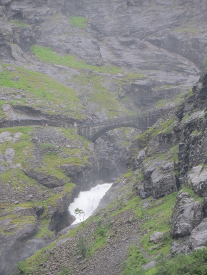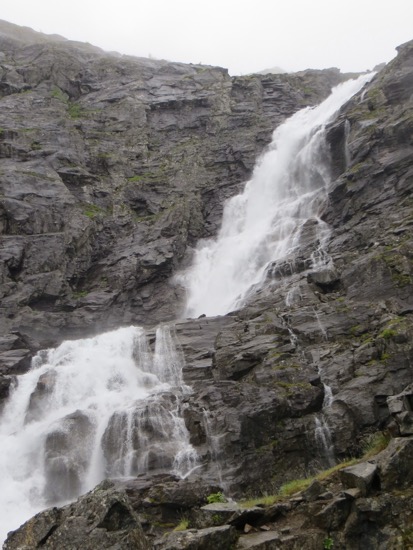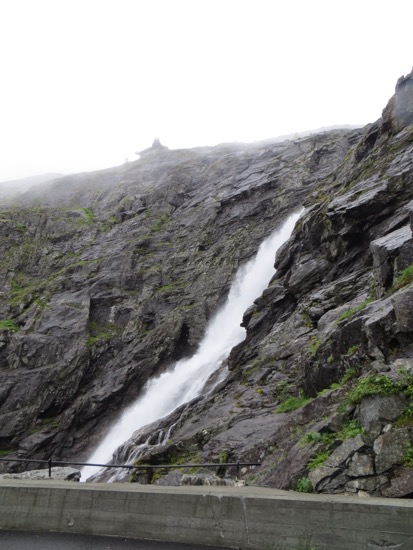 We rode the ferry to the beginning of the Trollstigen Road. It was raining on and off. The drive was still nice and pretty easy until we reached the fog. There was a collection of tour buses at the top of the Trollstigen or “Troll’s Ladder”. Everyone from the. The bus riders were at the observation point peering into the thick fog. It appeared pointless so we headed down. We reached a point below the fog where we could see what was ahead of us.