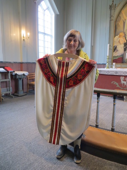 After the previous day’s drive, we were happy to be able to just drive around the little town. After the usual gigantic breakfast, we went to the church where our Grandmother was baptized and confirmed. It was built in the 1860’s but is well maintained. Grethe showed us the vestments that she made for the Pastor. The designs were approved by the Bishop.