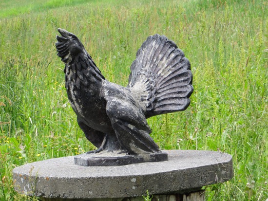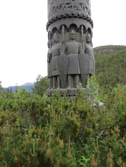 Norway in the rain is beautiful. In the sun, it is stunning. We were following the river that crashes through Lom. We didn’t drive far before making one of the forty or so stops that we would make to take a picture and look around. There was a strange monument with Vikings who looked like they belonged in the Ring Trilogy. It was designed like Trajan’s Column. I think I liked the stone chickens lining the driveway better. Of course, there was a bear.