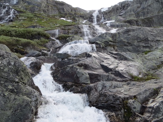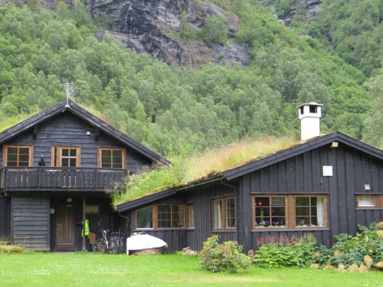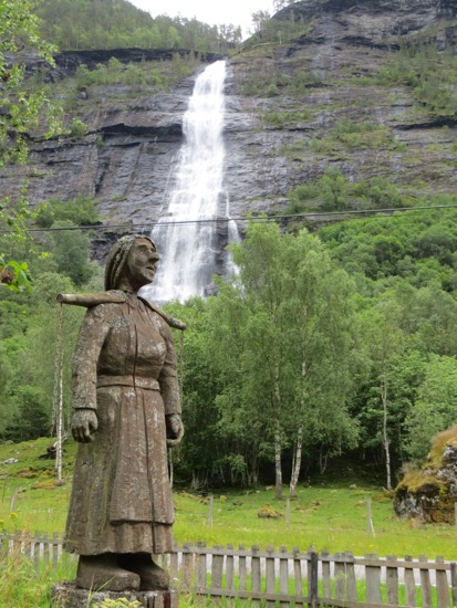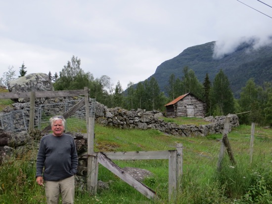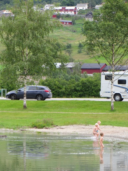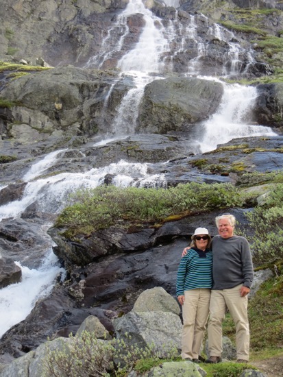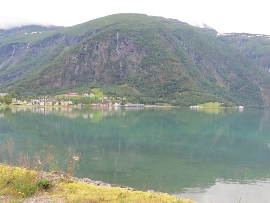 We headed down to the Lustra Fjord. It wasn’t the Trollstigen but I figure Dave will talk to me as having earned a couple of stripes. We ate lunch while a road crew removed some boulders from the road. We reached our campground. Peggy brightened up when she saw her shower and the laundry facilities. I found us some chicken, corn on the cob and tomatoes for dinner and even a couple beers. Our campground lodging even has its own fantastic waterfall. I hope they turn it off at night so we can sleep. Just kidding.