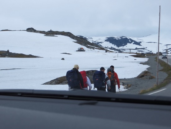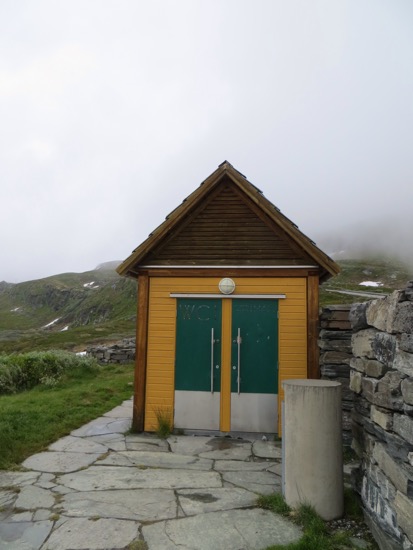 It is hard to believe that this is late July. It got more forbidding. We saw a group of hardy backpackers heading away from the road. I gave them the thumbs up. The rock cairns told travelers where the pathway went. We followed the snow markers. The heated WC was a small miracle. There was even hot water.