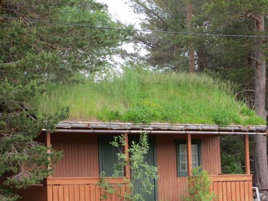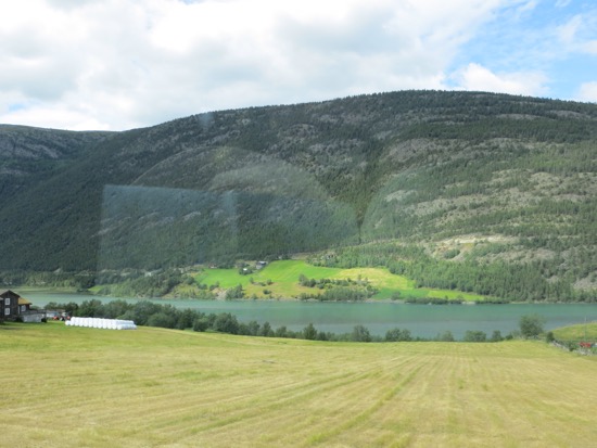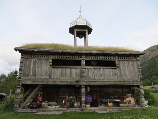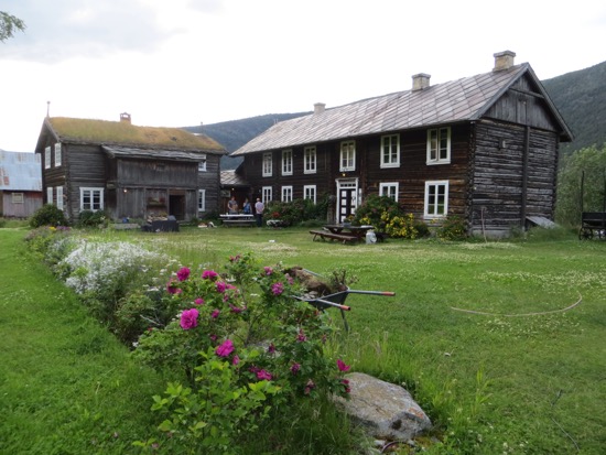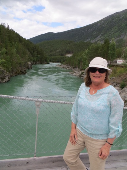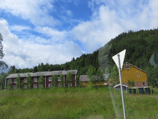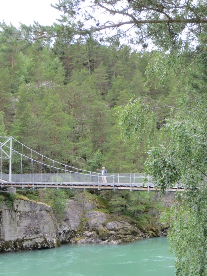 We reached the Gudbrandsdal Valley that opens up south towards Oslo and left it at Otta and headed west. It took another hour to reach our destination in Lom. Lom is where we had been a week ago as we headed towards Geiranger Fjord. Along the way we stopped to cross a foot suspension bridge and take a few pictures. We are looking for the archetype Norwegian farm or “Gard”. The ideal would include a white farm house flying a Norwegian flag, red barns and outbuildings one of which would have trees growing from the grass roof and cows grazing. We are still looking.