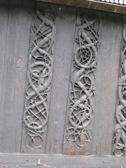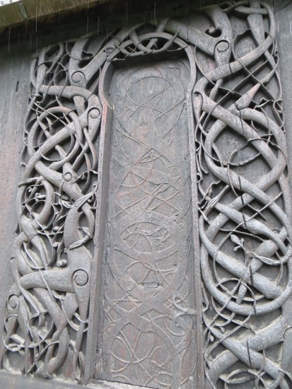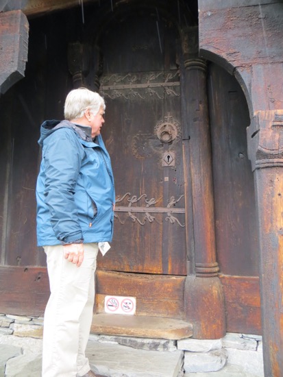 We arrived in time to walk up  the half mile from the parking lot and got permission to take pictures outside before the ferry tourists arrived. The carvings from the pre 1130 church are still Viking. The church that stands today is the fourth rendition on the same site. The others were built in the previous 100 years. Some parts were reused like the carvings on the portals outside. The rest was constructed and stands with some strange modifications as the oldest wooden church in the world as recognized by UNESCO.