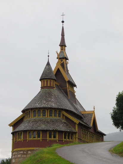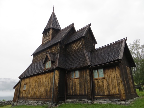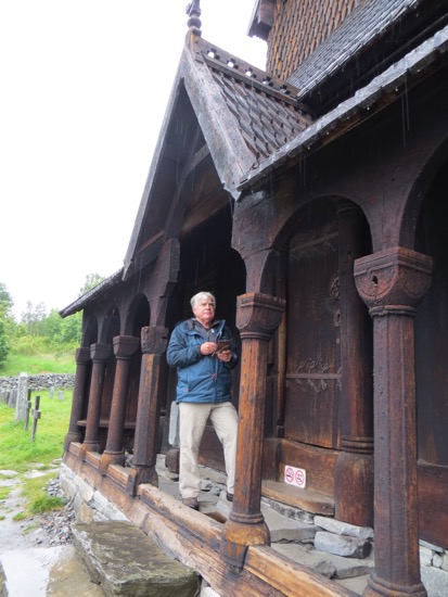 Enjoyed a filling breakfast with hard-boiled eggs at our waterfall side camp ground. A quick ride took us to the site of the Urnes stave church – the oldest wooden church in the world. But first we needed to manage a 20 mile drive along an impossibly narrow road. It was necessary to stop and backup to a wider spot several times. The unlighted tunnels were the scariest. We survived.
