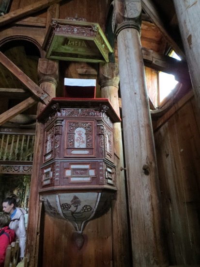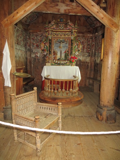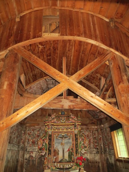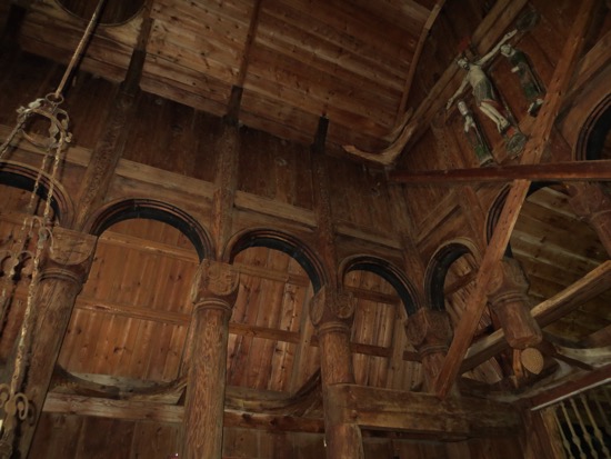 The basic construction is the same as in Lom with planks or staves planted in the sill and ceiling beams. The guide was excellent and described the process used by the builders 900 years ago. The trees selected for the structural posts were girdled and left to stand for 10 years before cutting them down. This allowed for natural drying with the result that there was no checking or splitting. The Vikings used the same process for their masts. I guess you don’t mess with something that works.