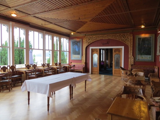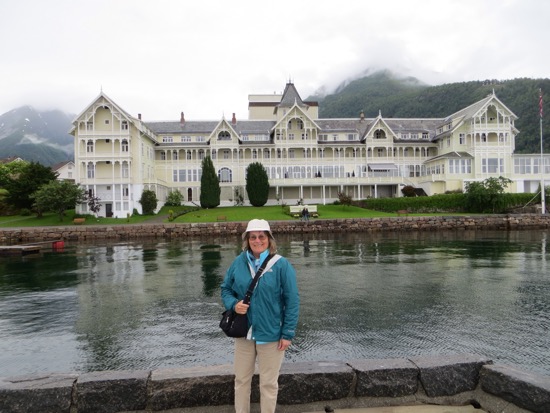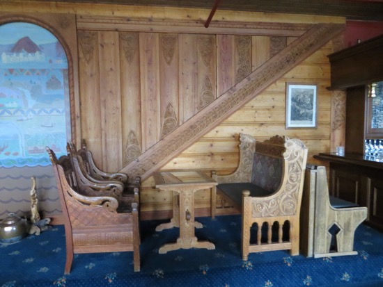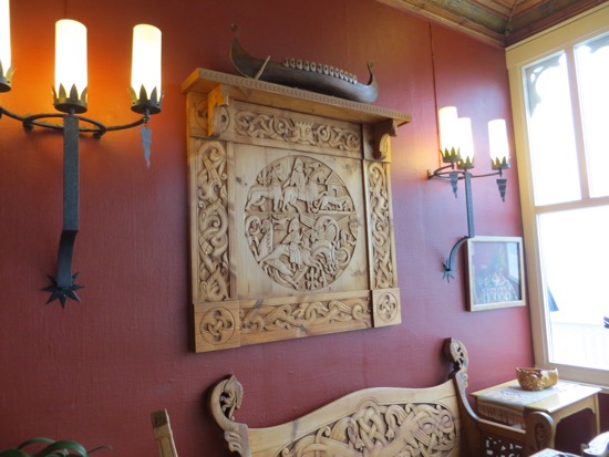 I guess the highlight was the gallery where we found a watercolor reproduction that almost meets the standard for our ideal Norwegian farm picture. Now to get it home safely. The old Victorian hotel was impressive from the harbor. Less impressive was the Best Western style modern addition that destroys the quaint village look. The hotel’s most famous guest was Kaiser Wilhelm who arrived in grand style on a specially built staircase with his naval entourage. The squadron returned with him every summer for years. The hotel became a must see and stay. We didn’t manage a stay but we did wander the public rooms unmolested. I have to admit that the Norwegian Romantic style was a carving masterpiece.