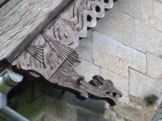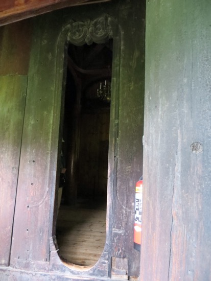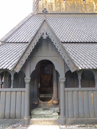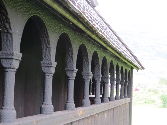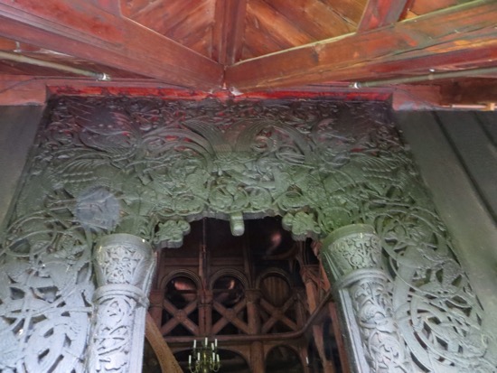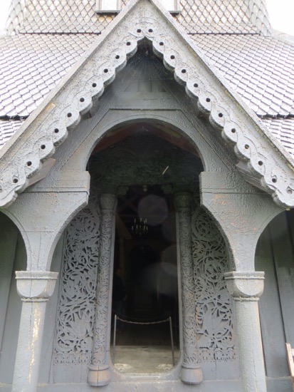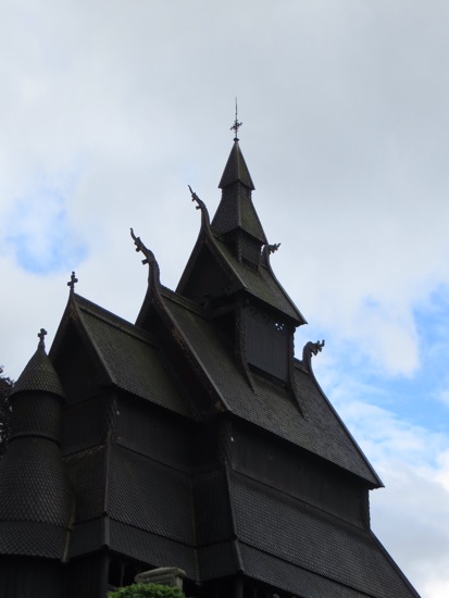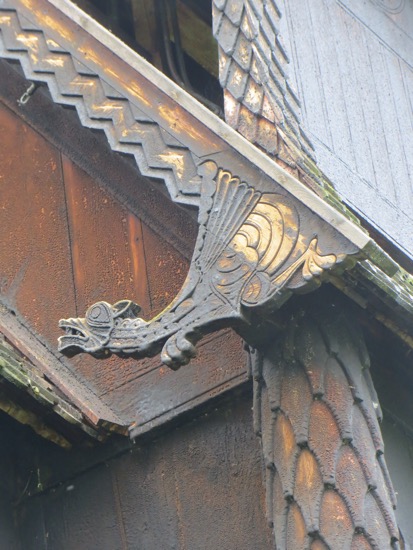 I kind of focused on the medieval elements like the doorways that were high and round on the bottom. It was believed that Satan had no knees to bow down before God. Therefore the doors were designed for only people who could bend their knees and climb in. It came to me that the dragon motif is carried well beyond ends of the eaves. The wooden shingles appear to me to be dragon scales. On the bell tower the scales are on round supports that look like a Viking dragon. Maybe I have been in Norway too long.