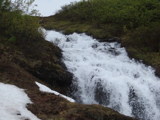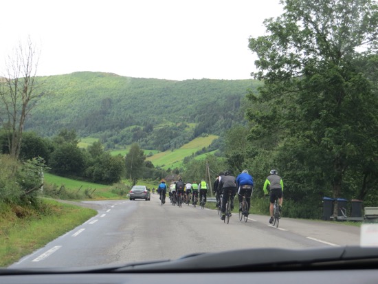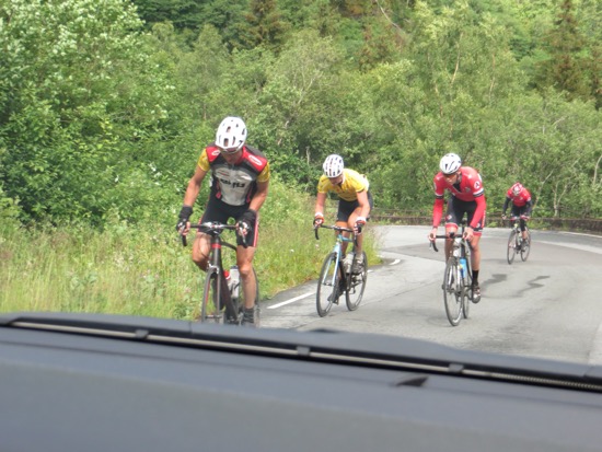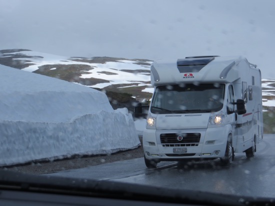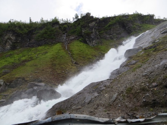 We finally headed uphill and encountered the bike riders who were evidently in some kind of race. There were around 200 or so sharing the narrow road with the shep and oncoming traffic. As we neared the top we found ourself in the snow covered Norwegian wilds. Water is everywhere with astounding waterfalls and rivers gushing from the snow banks.