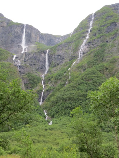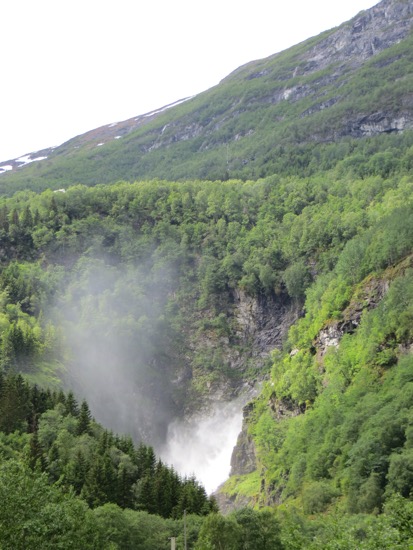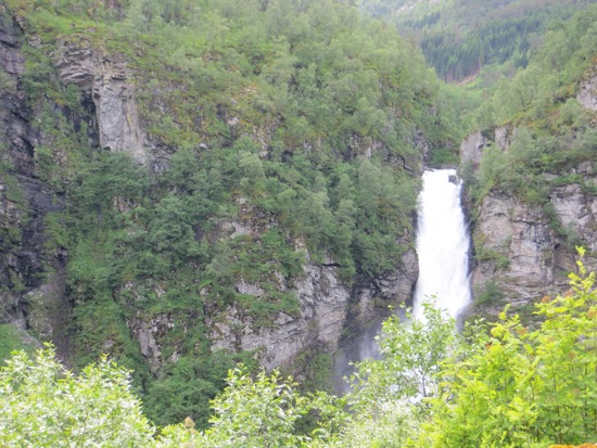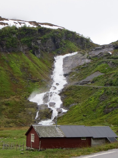 The signs warned us about a steep road. The descent down a Norwegian Lombard St. That was 10 times the length of our San Francisco Lombard St was exhilarating to say the least. And since waterfalls are crashing down all around you, it is kind of like drivng down Nevada Falls in Yosemite. Peggy could t click the camera fast enough. Thankfully it was too much for even the most intrepid tour bus.