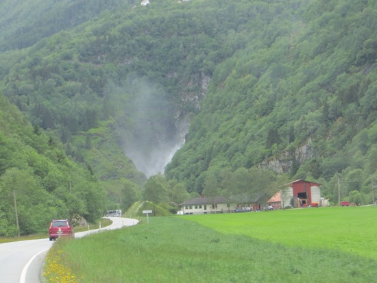 We continued down the narrow canyon with waterfalls to the right and left. Dozens  of them cascaded down the cliffs. They were huge. Gigantic sprays or flumes surrounded us. It was amazing to paraphrase Huell Hauser. After five miles of this we reached the end of Naerefjord at Gudvangen. There was a giant collection of tour buses and a cute Viking tourist village. We took photos and left. Our goal was ahead. It required driving through a 6 mile and a 3 mile tunnel. Peggy made it.