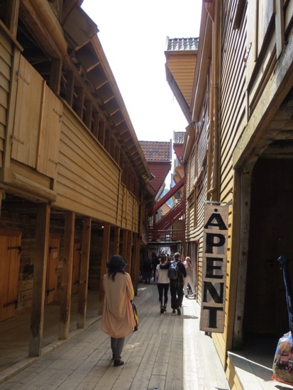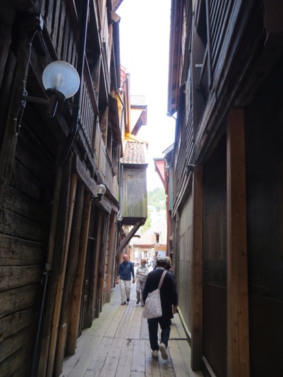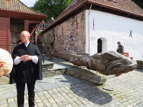 Tom, our faithful GPS navigated to the hotel. We quickly checked in and headed for the meeting point for the Bergen walking tour. We needed to walk through the fish market which felt like a tame Fisherman’s Wharf. It was full of tourists. During the summer, Bergen frequently has 8 cruise ships tied up out of sight from the historic harbor. We quickly bailed out of the TI with the crowds and found our own way.