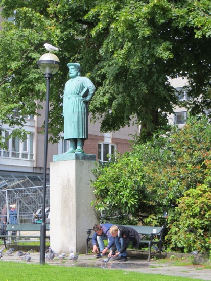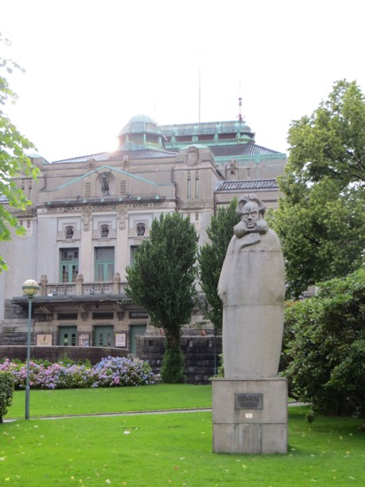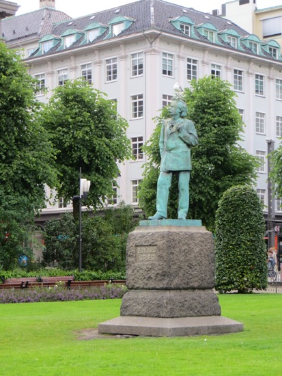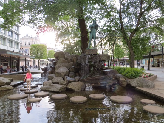 A walk by the opera house included statues of the composer Greig with a seagull on this head. He was at least comforted by the elegant music platform. The violinist Ole Bull continues to entertain atop a fountain. Ibsen’s scowl assures that no pigeon will attempt to roost.