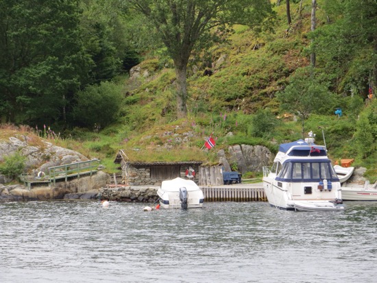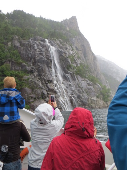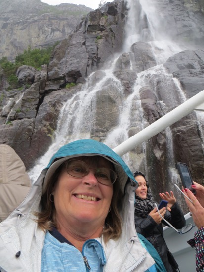They took us by one more highlight. There was a waterfall that reached the boat. They had built it up as quite a big deal. After the other waterfalls that we have seen in Norway, it was small potatoes. It reminded me of the scene in Crocodile Dundee when the street thugs pull their switchblade on Dundee and pulls out his real knife about a foot long. It was fun to see everyone snapping pictures and selfies in front of this relative trickle.