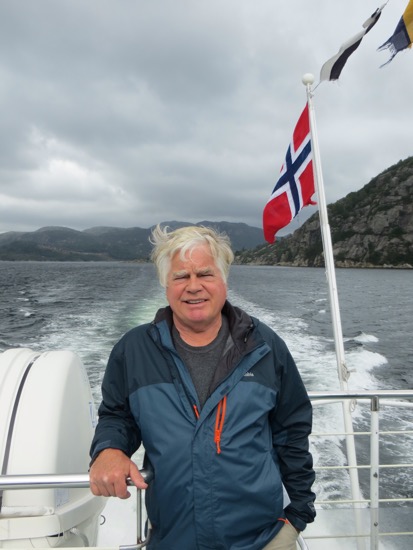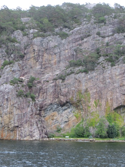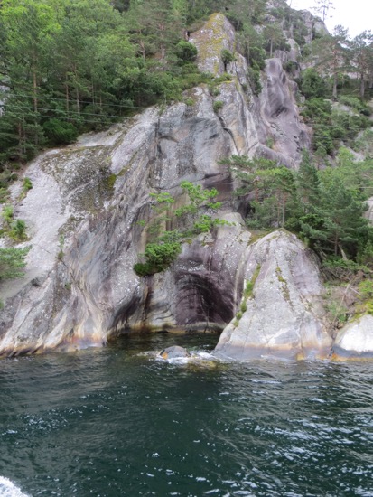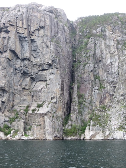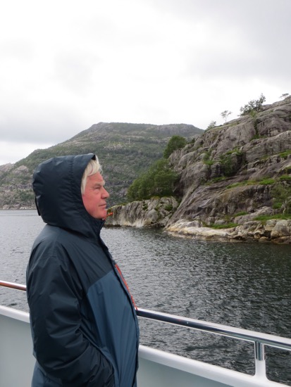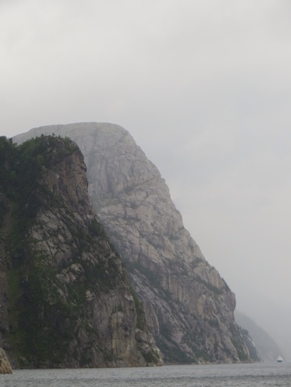 We decided to take the fjord cruise to Pulpit Rock and the Lysefjord over which the rock presides. The fast boat took us and another hundred tourists on a tour of the local waterfront before heading to Lysefjord. The sun wasn’t out but it was pleasant. It is nice to see the vacation ho,es on the almost endless waterfront. It seems that every Norwegian has so,e kind of cabin or place to go on their many holidays and vacations.