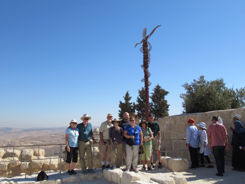 We drove a few miles up hill to the top of Mount Nebo. We passed by another Moses spring that Moses created with his rod to keep the thirsty Hebrew happy. The summit is as close to the promised land as Moses will get. From the vantage point, we could see the Jordan River, the Dead Sea,Jericho and Jerusalem in the distance. A new basilica is under construction by the Franciscans. We enjoyed the early mosaics that were the floors of the many churches built on the site.Pastor Matt enjoyed an ecumenical moment with the Local Franciscan Friar.