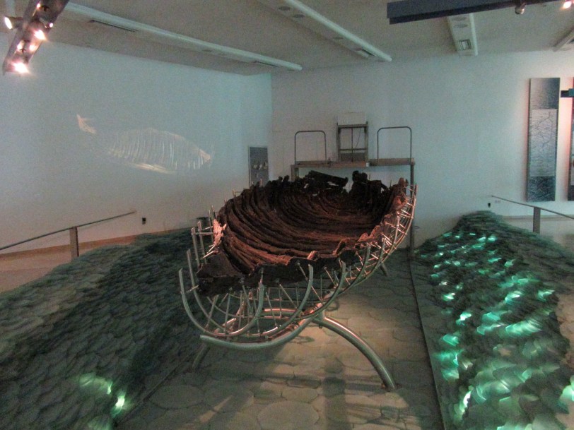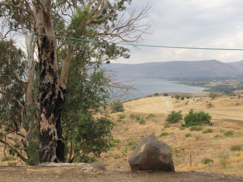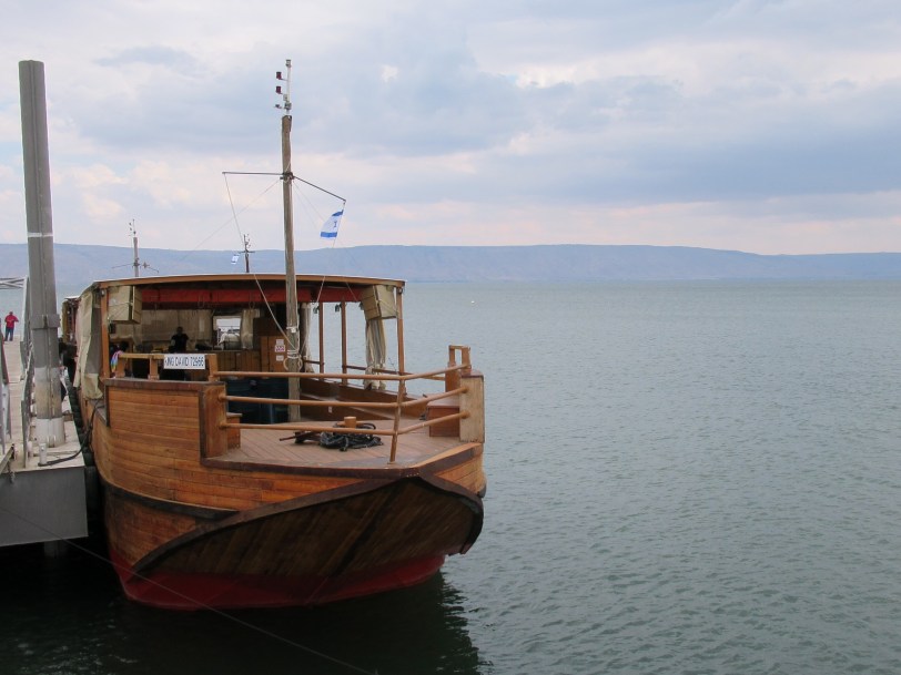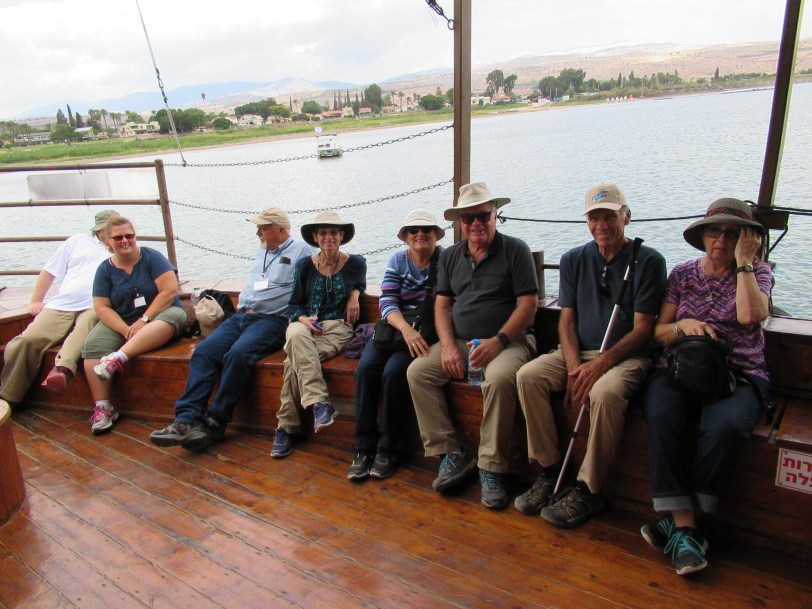 We took a lunch break sitting in front of giant outdoor AC units and are our schnitzel. It is much nicer to have a mid day meals than try to make it between breakfast and dinner. Besides we needed to get ready for our Galilean boat ride. The discovery on a ancient boat preserved in mud has provided the impetus for a local mini-tourism industry centered on the restored boat and boat rides on the Galilian lake. The scow like boats were a bit goofy but it was a pleasant change from the van. We were able to see our morning sites from the water as well as say that we had launched from the hometown of Mary Magdalene.