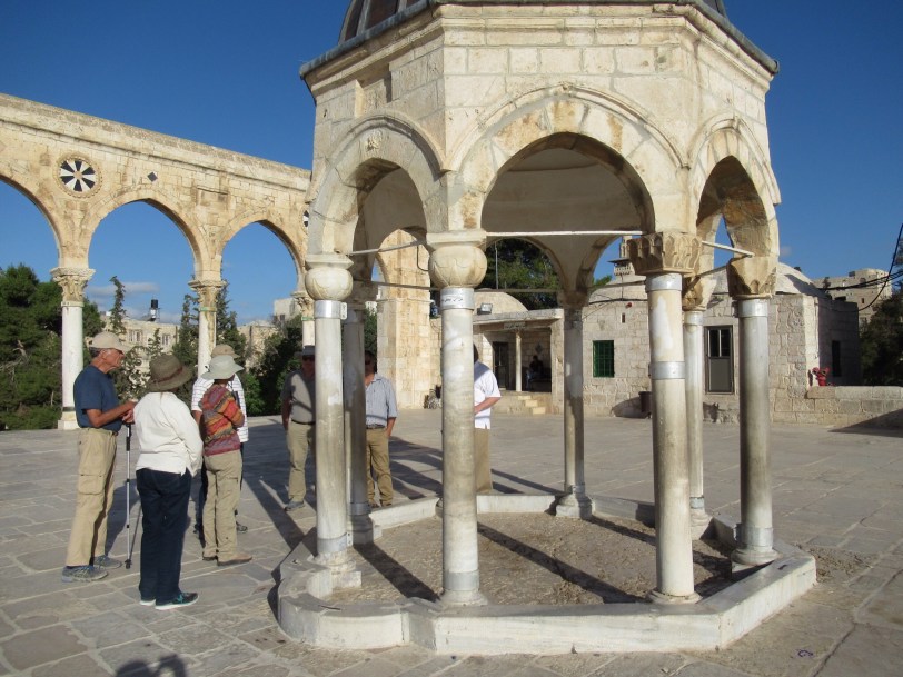 Entry to the Temple Mount can be a very maybe deal. We left the hotel in time to be there when the gates opened. This meant reaching the Dung Gate by 8AM. They haven’t used the gate for dung in a long time but the name stuck. No matter, we cleared the various security stops and found ourselves looking at the Dome of the Rock with its famous golden dome. Our guide Eriz gave us an impassioned explanation of the site’s significance to the Jewish nation as well as the Muslim interest in Jerusalem. We were careful to remain separate from eavesdroppers in case what was said might be seen as controversial. We were more concerned with not touching each other ( male and female) or looking like we might be sneaking a prayer. All of those activities are severely frowned upon by the Muslim watchers who govern the site. It was strange but OK. We did have the chance to wander around in a mostly crowd free environment. Actually, the site was being cleaned and there was no trash unlike most of the Arab areas where there is no shortage of debris. This is just an observation.