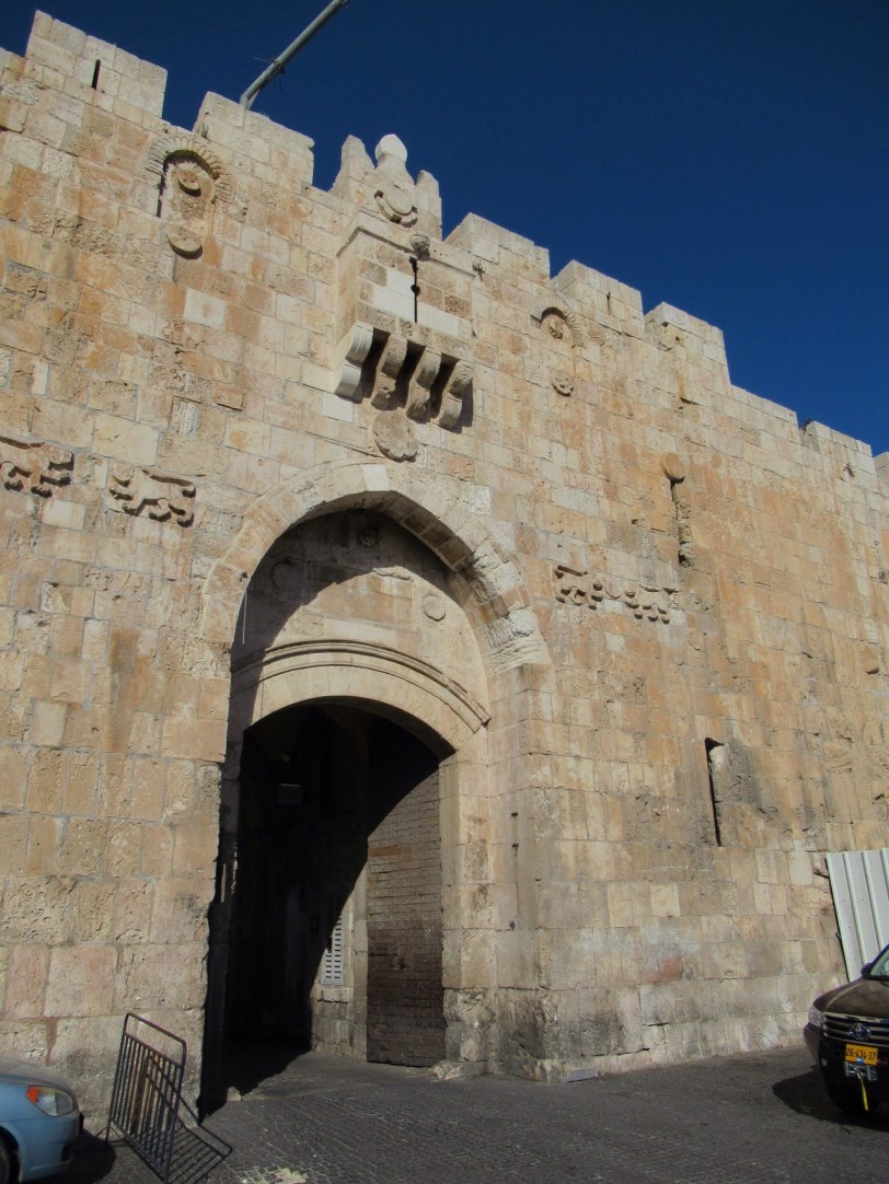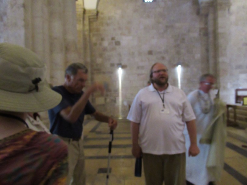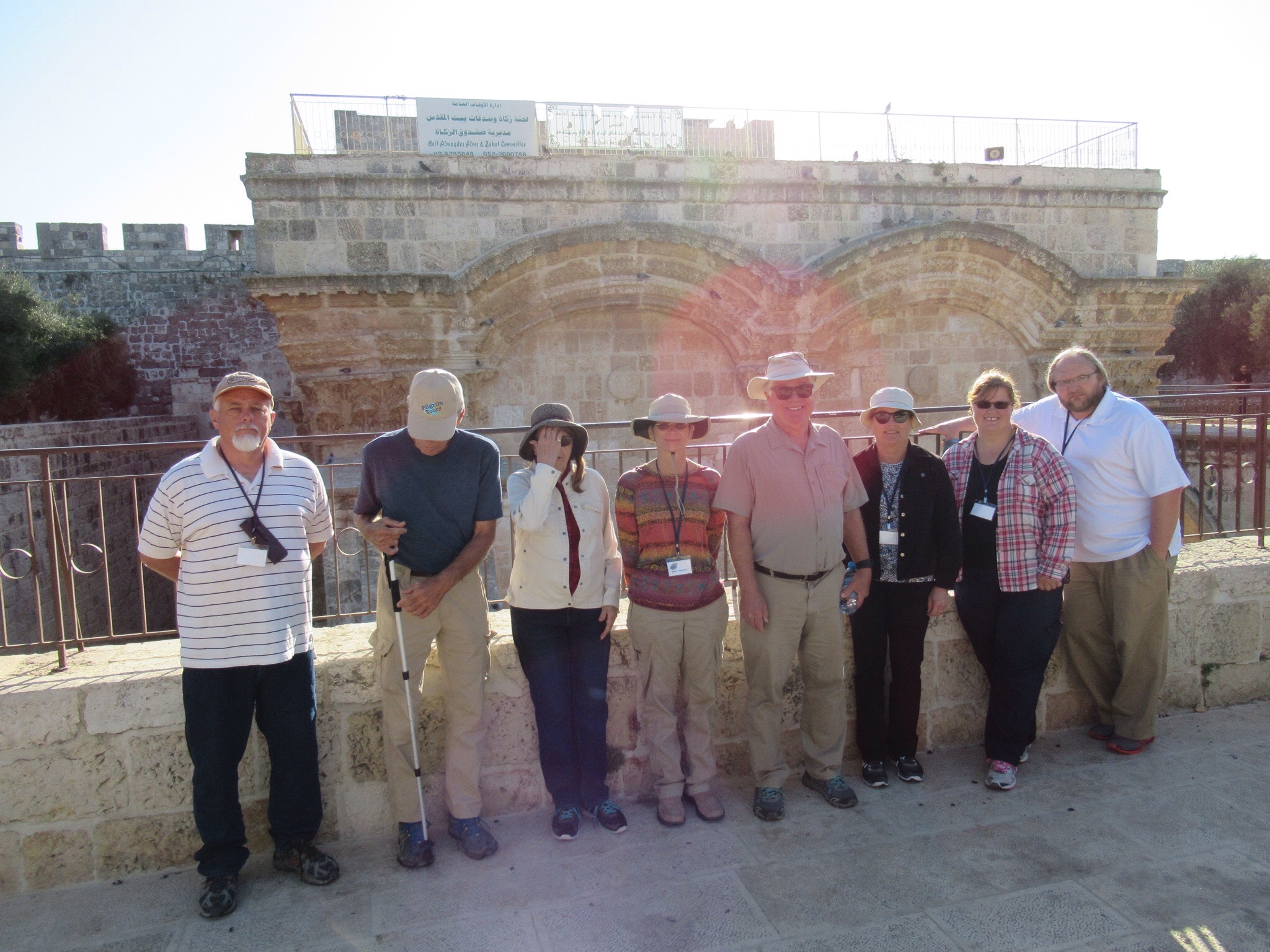 We went to the ancient site of the Pool of Bethesda and the Church of St. Anne, Jesus’ grandma. The pool was for healing and was located where sheep for temple sacrifice were prepped and cleaned. The old Sheep Gate is no longer there but rest of the archeological remains in good shape. The Catholic Church was there for us to sing a hymm and hear the acoustics in this Roamaesque church with Crusader roots. It was actually fun and quite good. We left the old city via the Lion Gate to catch our ride to the Mt of Olives. It was great that we had an Israeli armored personnel carrier to block for us as we headed up the narrow road to reach the view point.