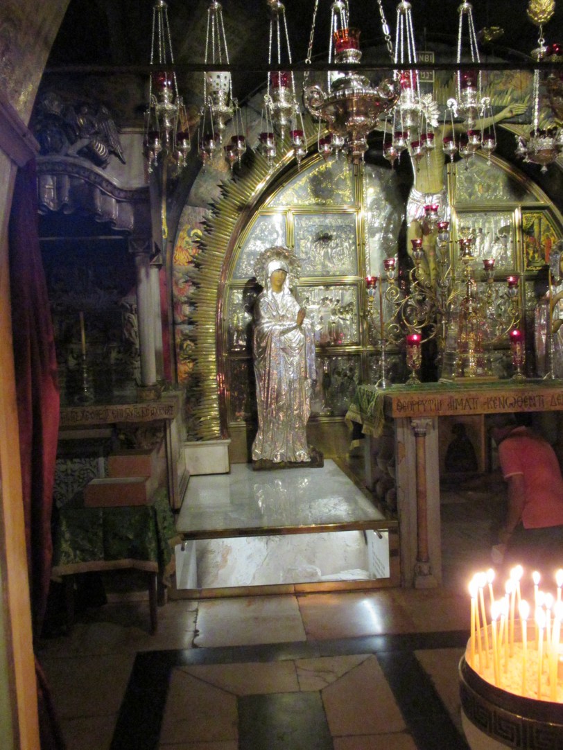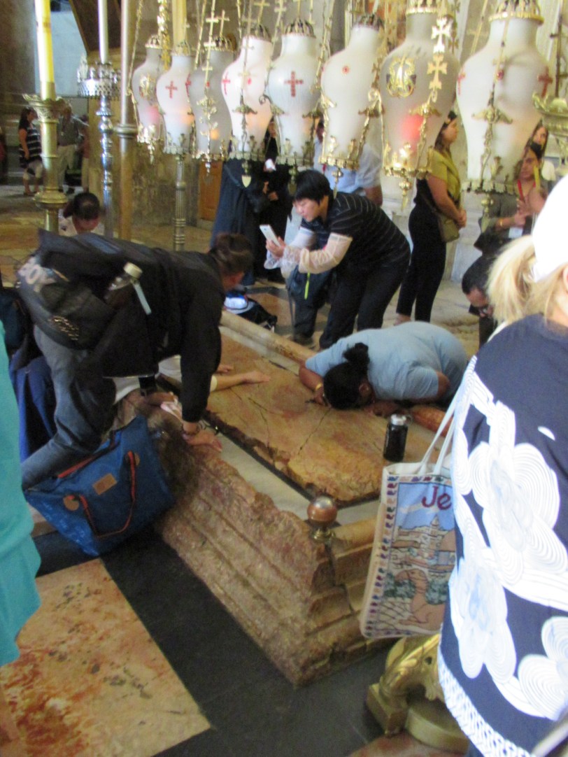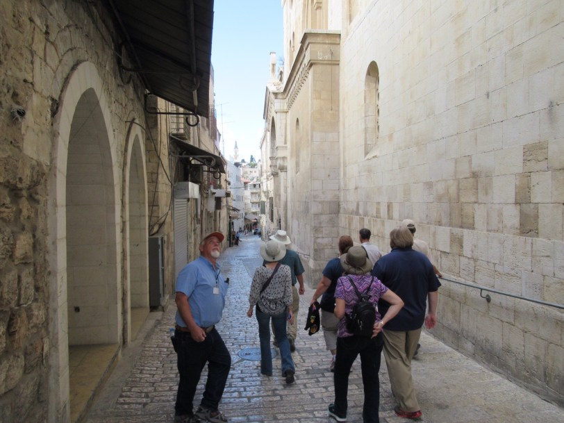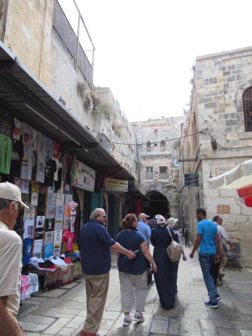 We emerged from the underground near the Via Dolarosa near the Lion Gate. We proceeded up the narrow road crowded with shops to,reach the Church of the Holy Sepulchre that is built of Golgotha. The way was pretty enmity and the shopkeepers seemed resigned to a slow day. As we reached the church courtyard, we braced ourselves for the sights to come. Peggy and I managed to to get close and see the traditional tomb and the site where the cross was placed all of which are inside the church our Protestant sensibilities were assaulted. Nonetheless, the sight of so many wildly different Christian communities from all the world interacting was the real sight.