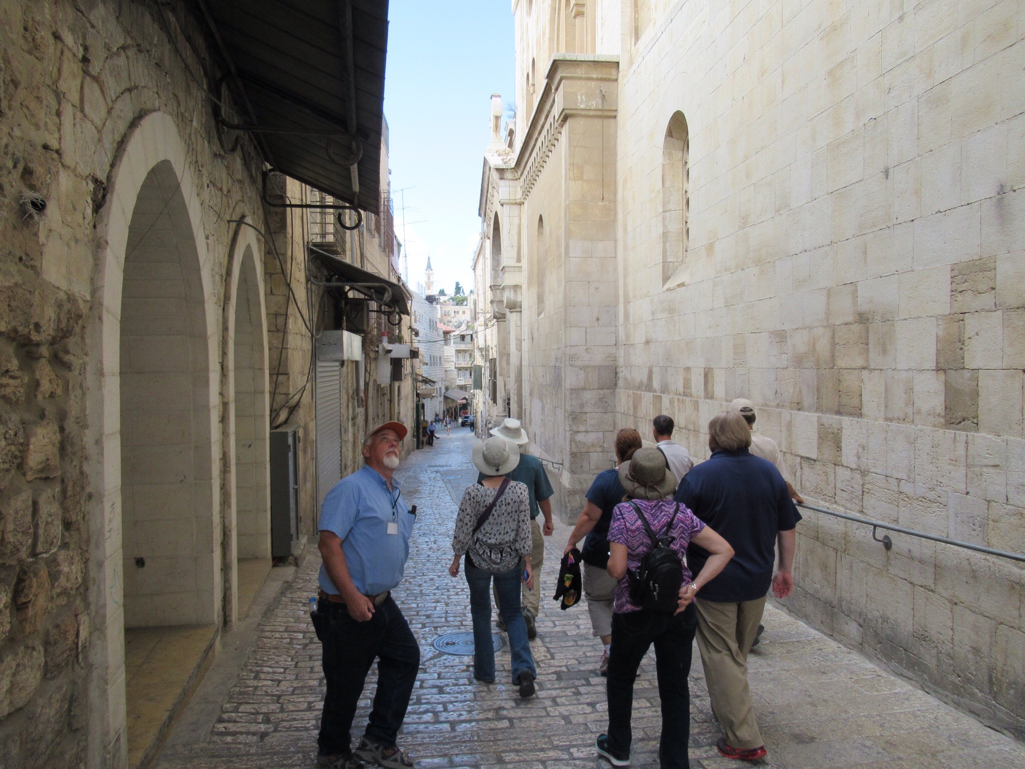 Beside the church are steps that were there in Biblical times to descend from Mount Zion to the Kidron Valley. These would probably be the same steps used by Jesus after his arrest in the Garden of Gethsemane. We follow them into the city and by the Western or Wailing Wall and the Rabbinical Tunnels.