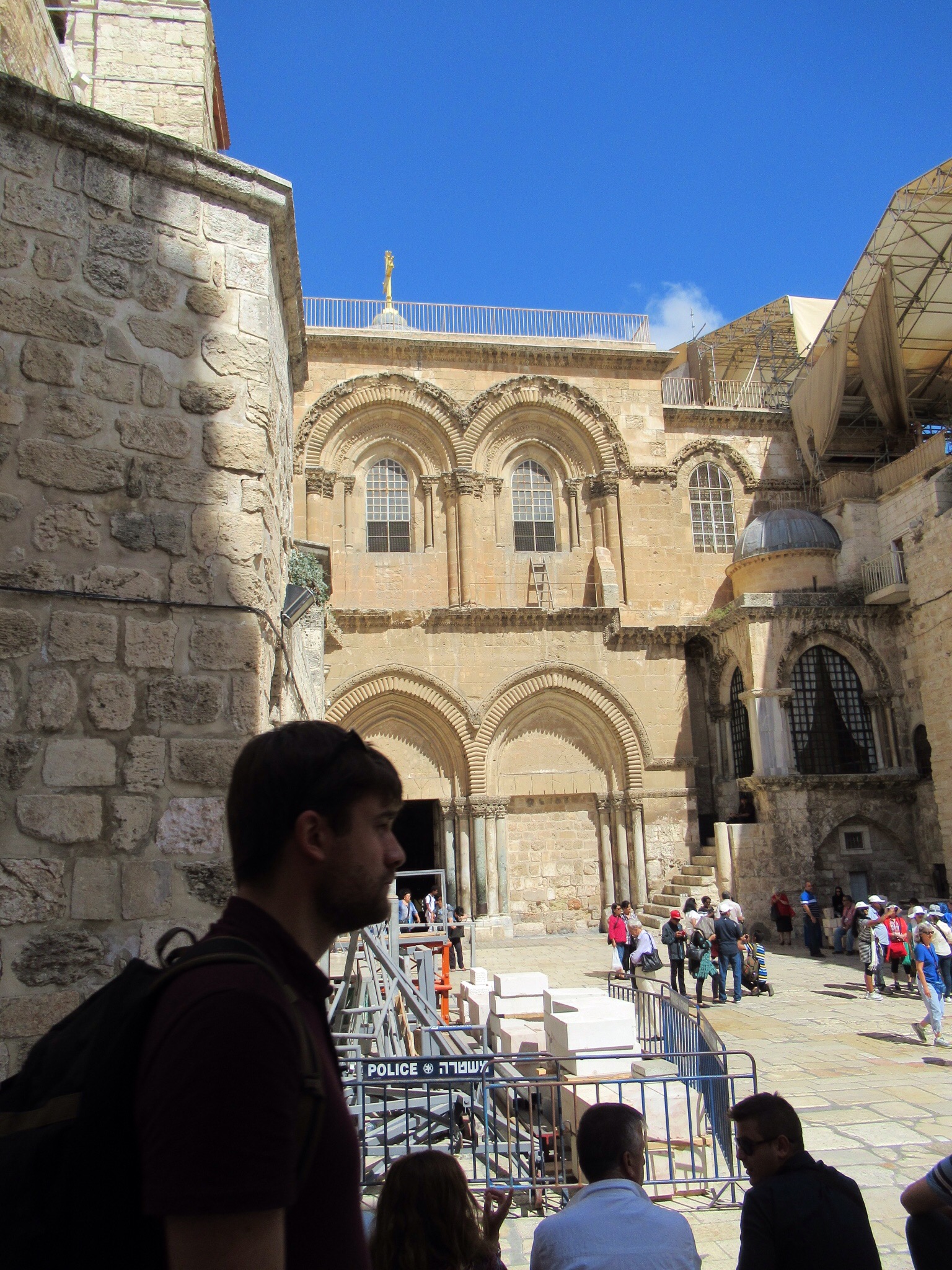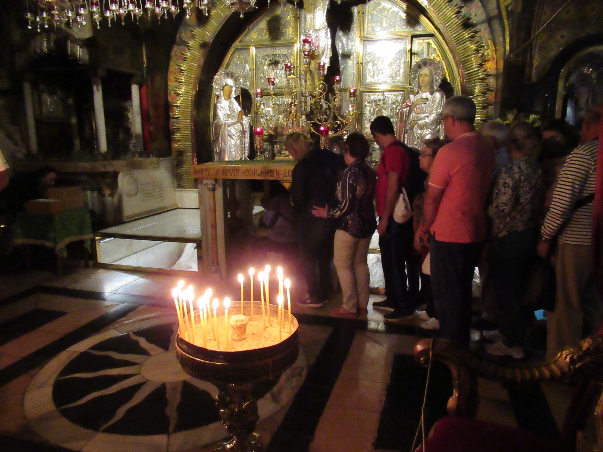 We emerged from the underground near the Via Dolarosa near the Lion Gate. We proceeded up the narrow road crowded with shops to,reach the Church of the Holy Sepulchre that is built of Golgotha. The way was pretty enmity and the shopkeepers seemed resigned to a slow day. As we reached the church courtyard, we braced ourselves for the sights to come. Peggy and I managed to to get close and see the traditional tomb and the site where the cross was placed all of which are inside the church our Protestant sensibilities were assaulted. Nonetheless, the sight of so many wildly different Christian communities from all the world interacting was the real sight.