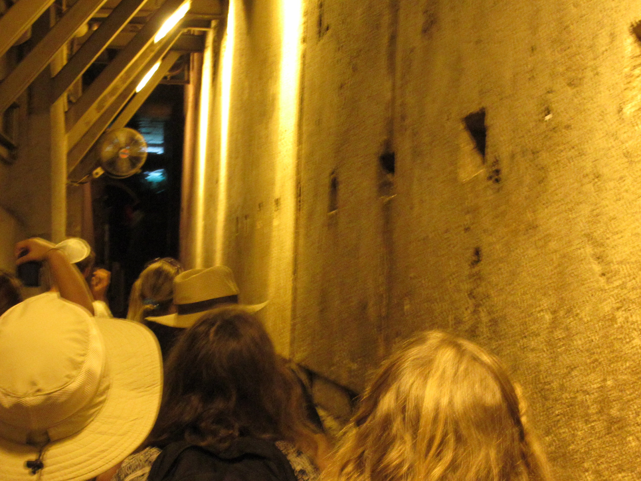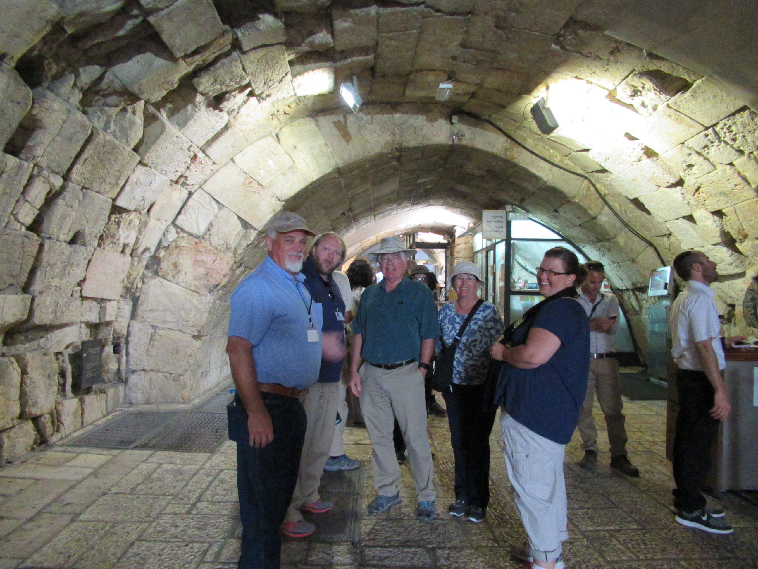 We then entered the tunnels that were next to the base of the “western wall” that Herod built to provide the foundation for the Second Temple. The Hasidic and other ultra-Orthodox Jews wear their mourning clothes of black. They are still mourning for the destruction of Herod’s Temple by the Roman’s in 70 AD. The temple was built a top the massive foundation stones that we were walking along. It was long and dark but still interesting as we reached the pools that provided water for the Roman garrison that was stationed next to the temple to keep an eye on the Jews in their temple.