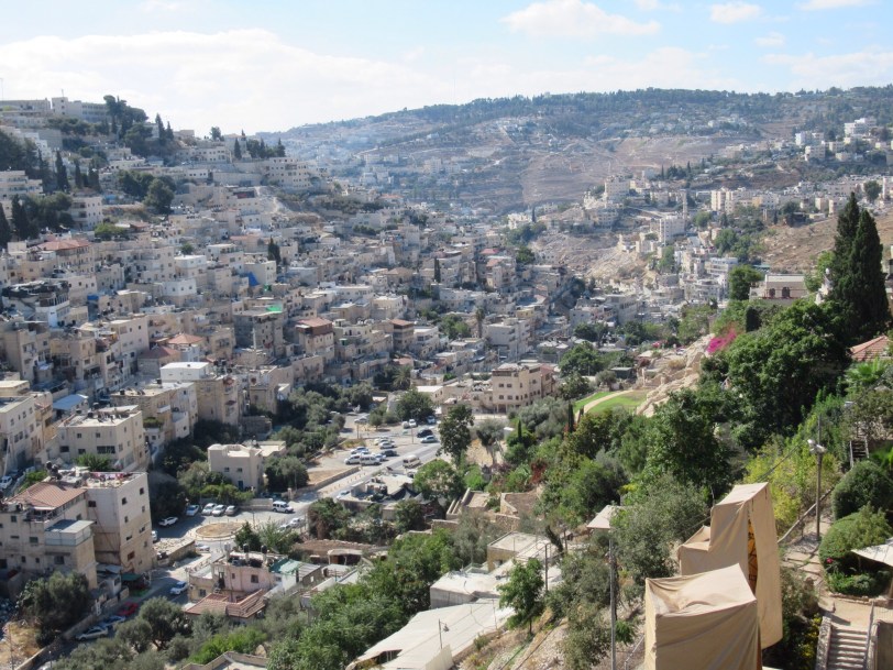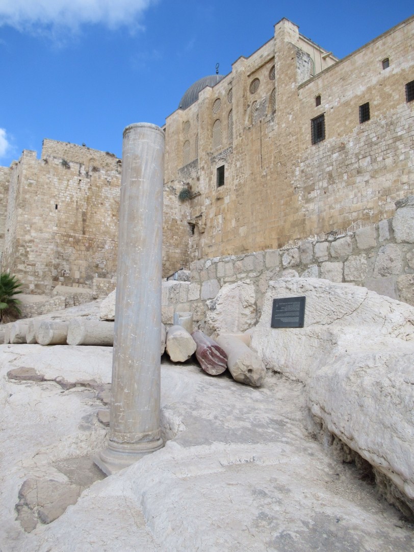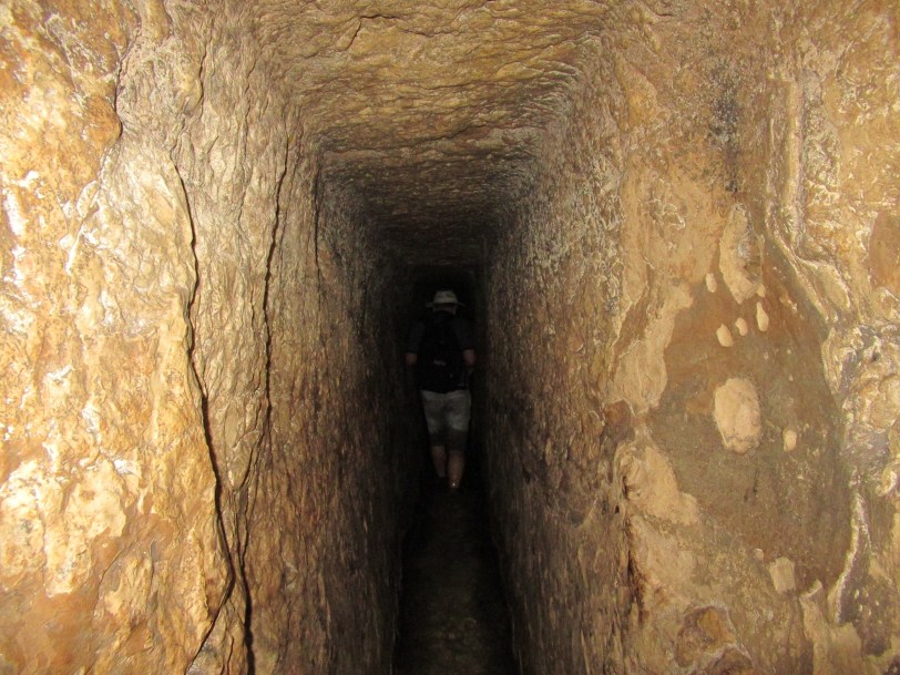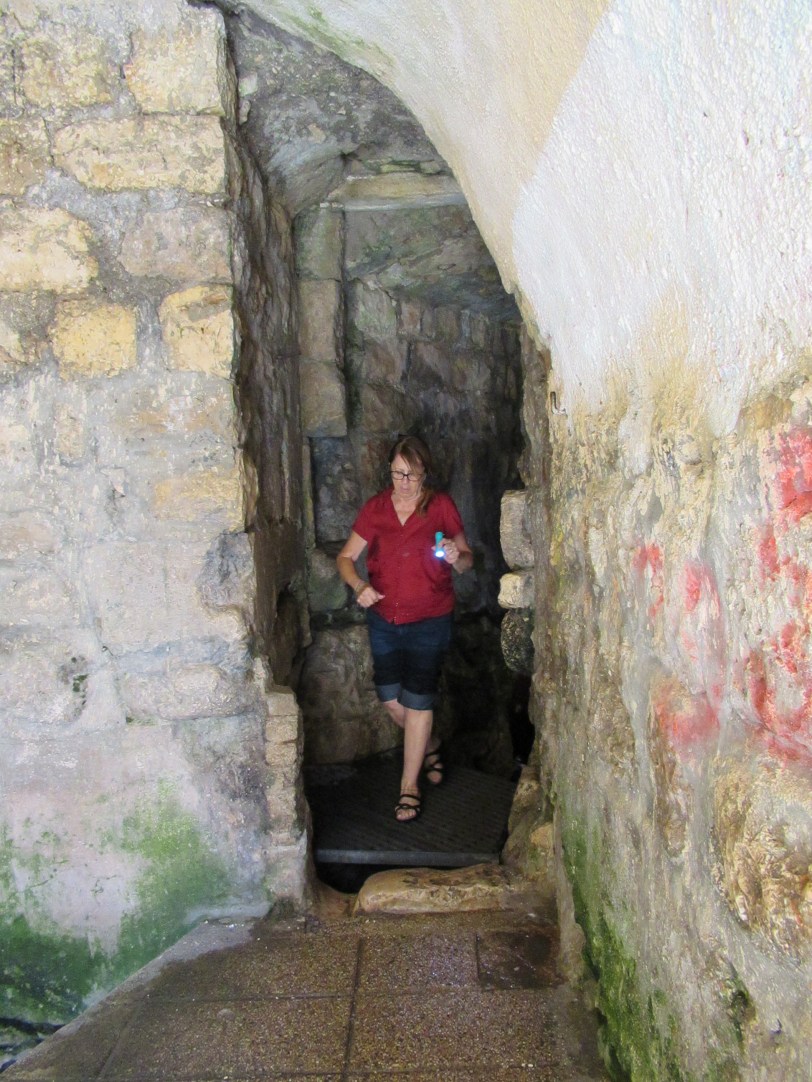 The “fun” event of the day was to walk through the tunnel dug during the time of King Hezekiah to protect the Jerusalem water supply from the Gihon Spring. The path to the tunnel was full of steps and people. When we finally got to the tunnel entrance, we found ourselves alone with our flashlights and an absolutely black hole in front of us that was filled with 2 feet of cold water. We plunged in and the water got shallower in a few feet. The remainder of the tunnel had around 6″ inches of cold water to slosh through. The tunnel was actually pretty easy to walk in which was good because it’s 500 meter length seemed several times longer. We managed and survived and were in good spirits when we reached the sun light.