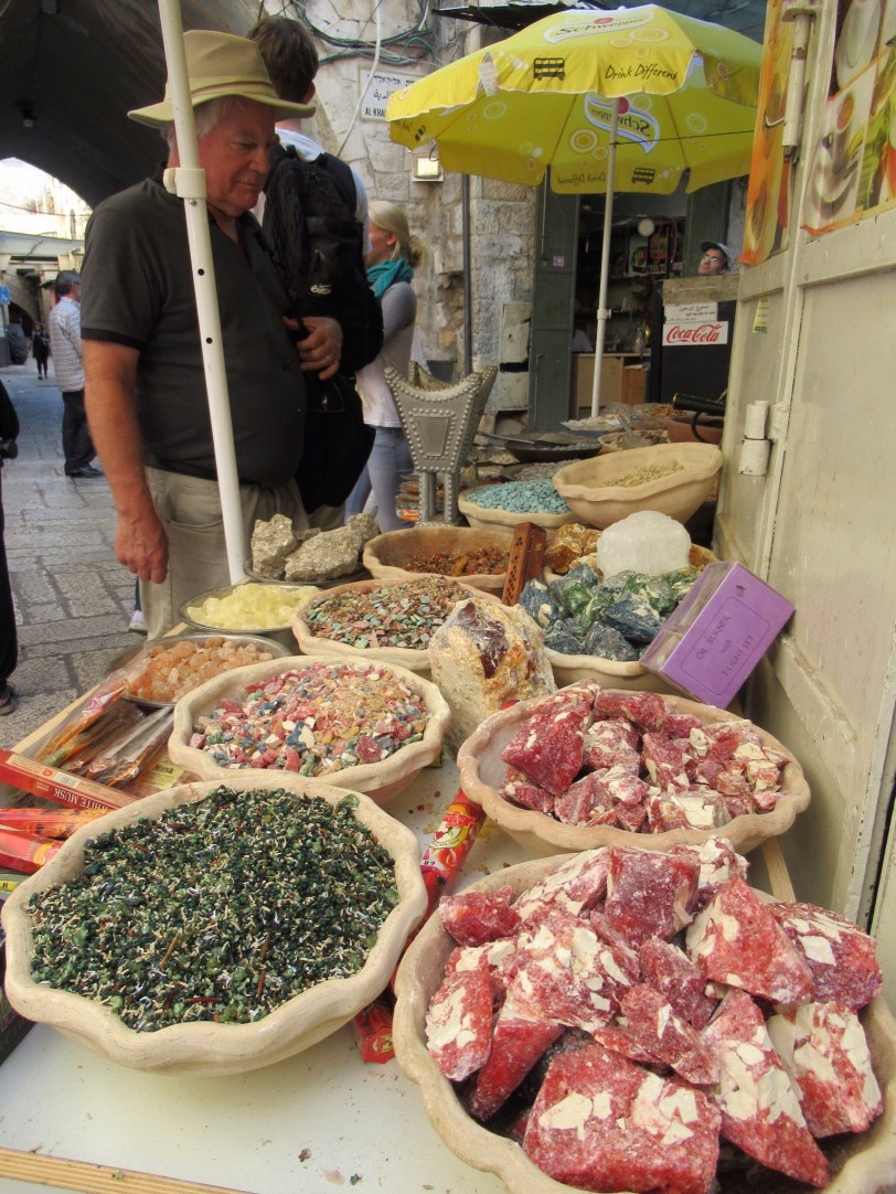 We returned to the hotel in the early afternoon. Peggy and I decided to return to the Old City and explore on our own. It is always an adventure to wander and get a little lost by just wandering down interesting looking streets. There are plenty like,that in the Old City of Jerusalem. There are also plenty of Isreali police and soldiers on almost every street. The people And the setting were amazingly interesting. The chance to see the myriad shops with their colorful and odiferous products was great. Mounds of spices, fruit, vegetables were mixed in with bakeries and meat markets. The partially butchered goats were a bit tough to look at with their weird furry tails on an otherwise skinned carcass. We made it out as the sum was setting with a few nice pieces of souvenir pottery.