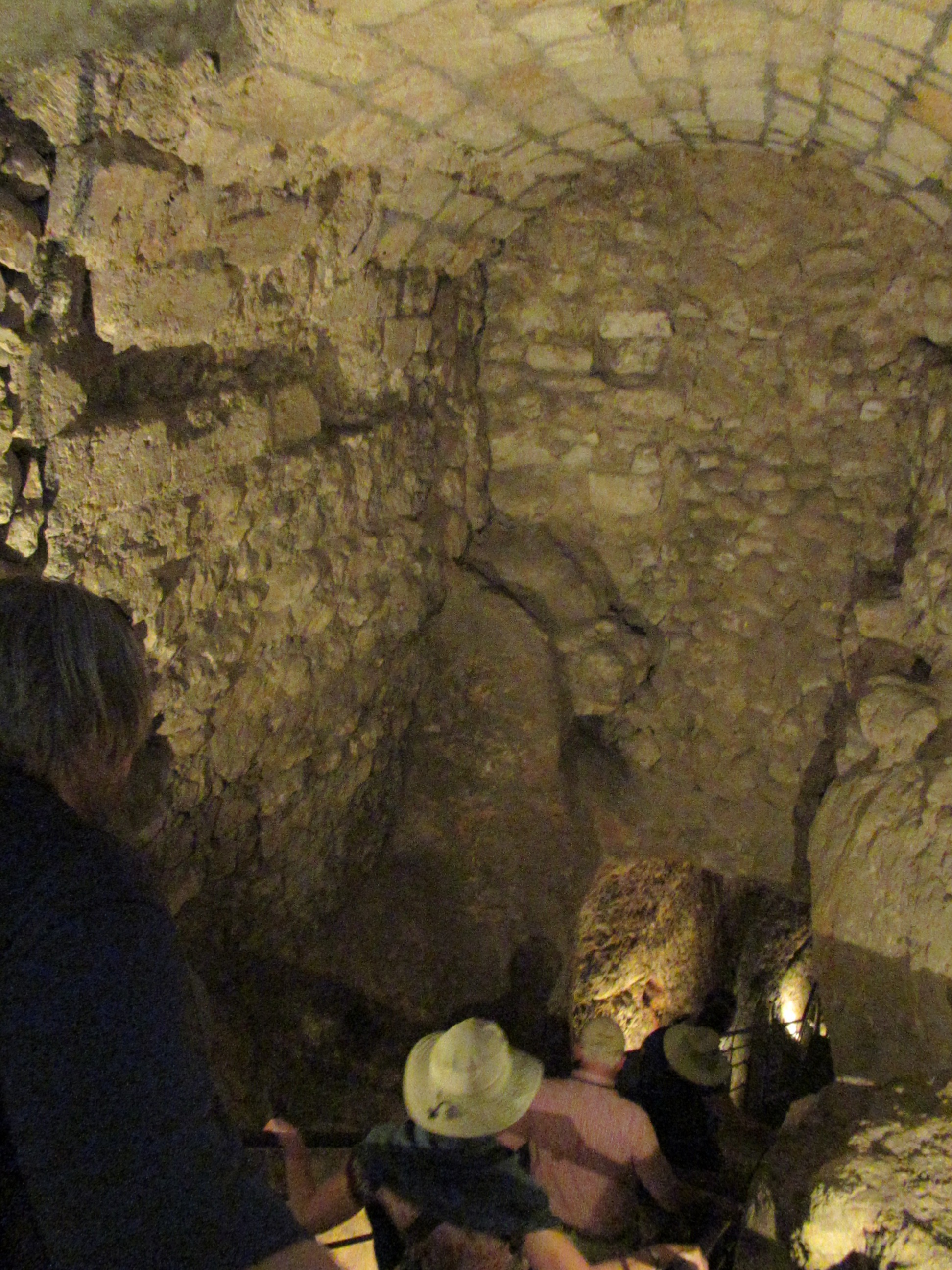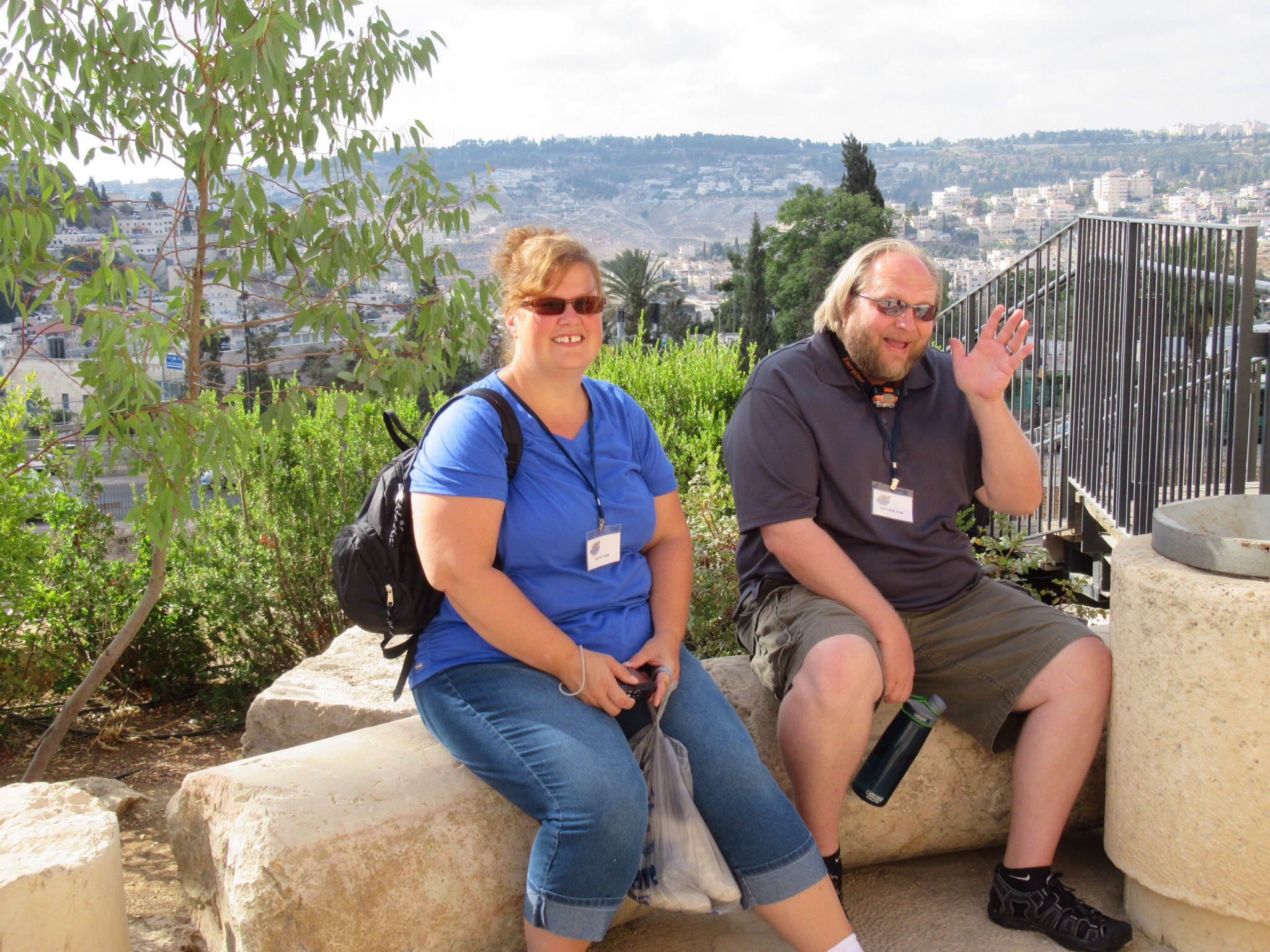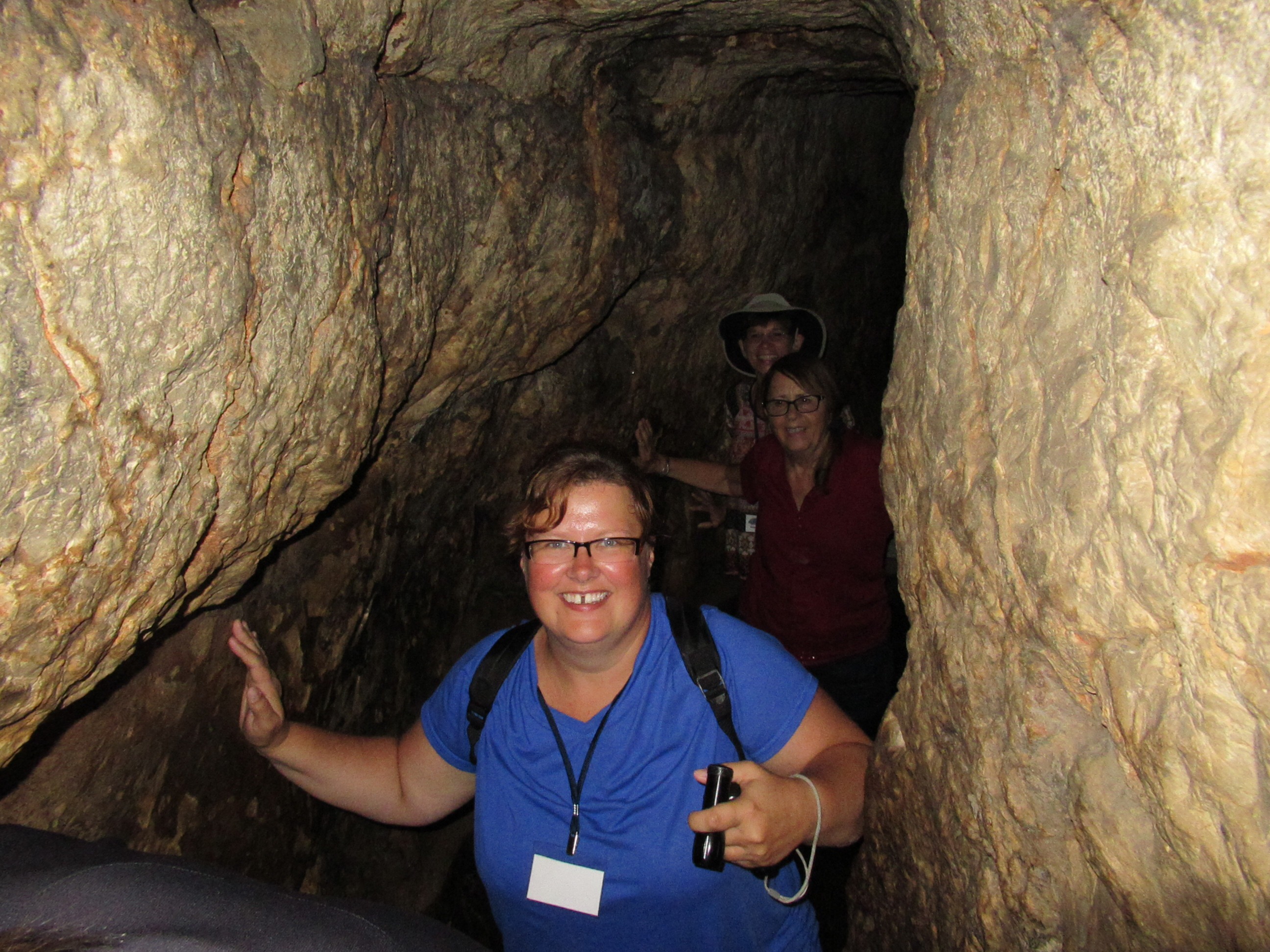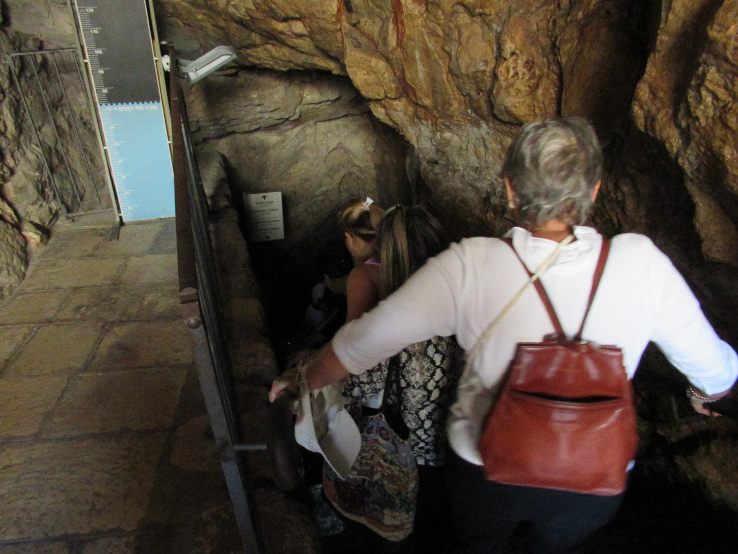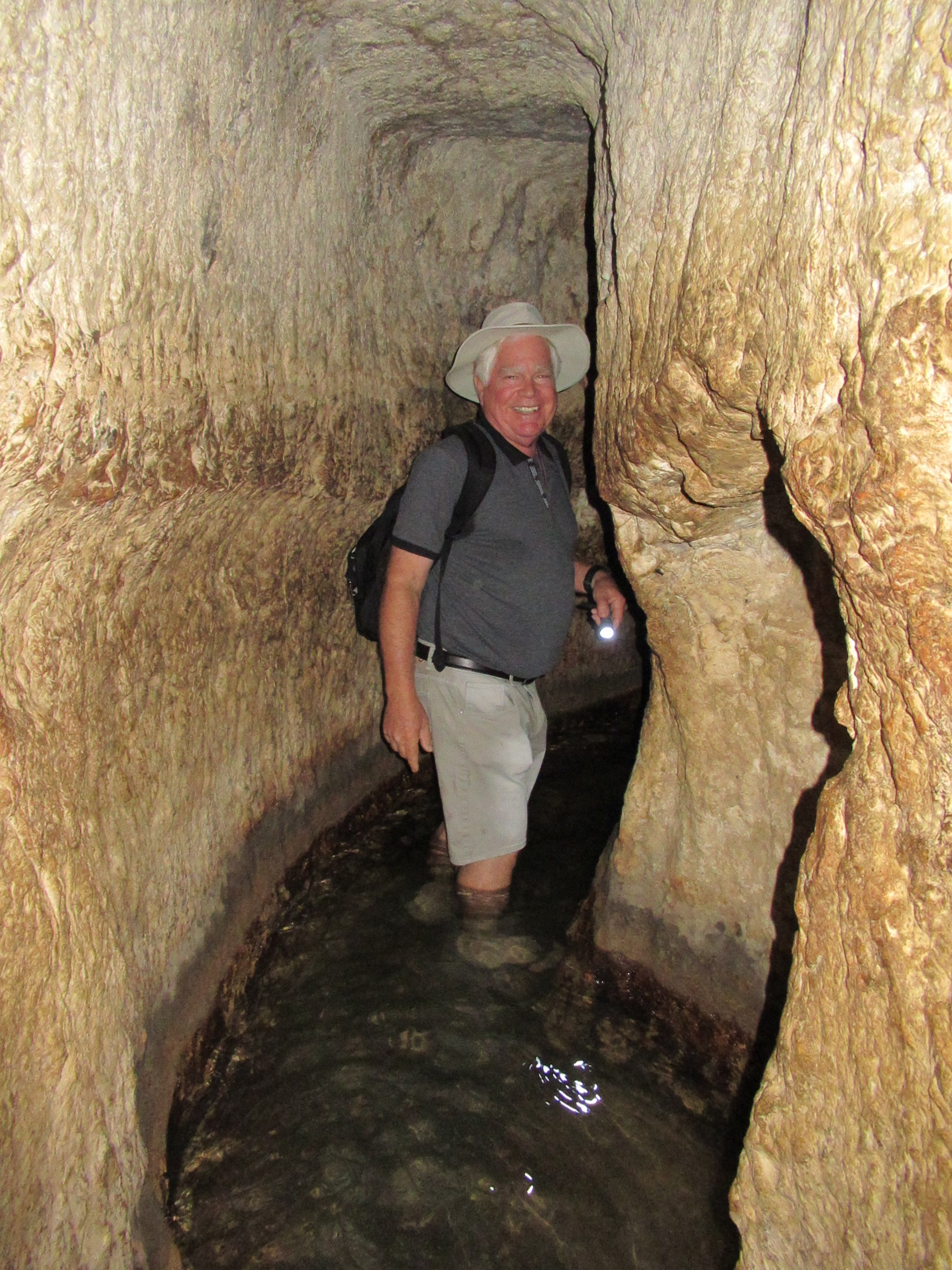 The “fun” event of the day was to walk through the tunnel dug during the time of King Hezekiah to protect the Jerusalem water supply from the Gihon Spring. The path to the tunnel was full of steps and people. When we finally got to the tunnel entrance, we found ourselves alone with our flashlights and an absolutely black hole in front of us that was filled with 2 feet of cold water. We plunged in and the water got shallower in a few feet. The remainder of the tunnel had around 6″ inches of cold water to slosh through. The tunnel was actually pretty easy to walk in which was good because it’s 500 meter length seemed several times longer. We managed and survived and were in good spirits when we reached the sun light.