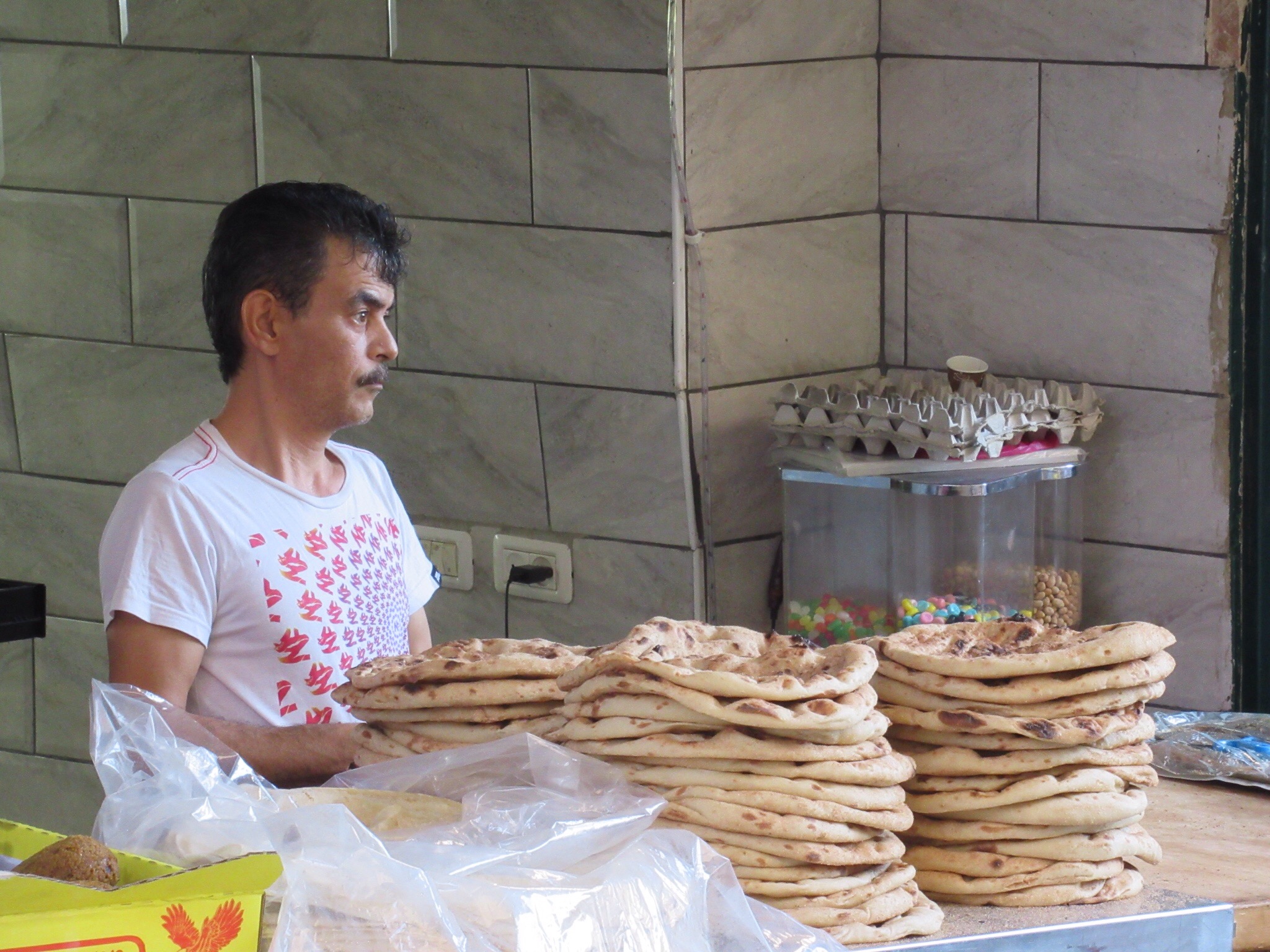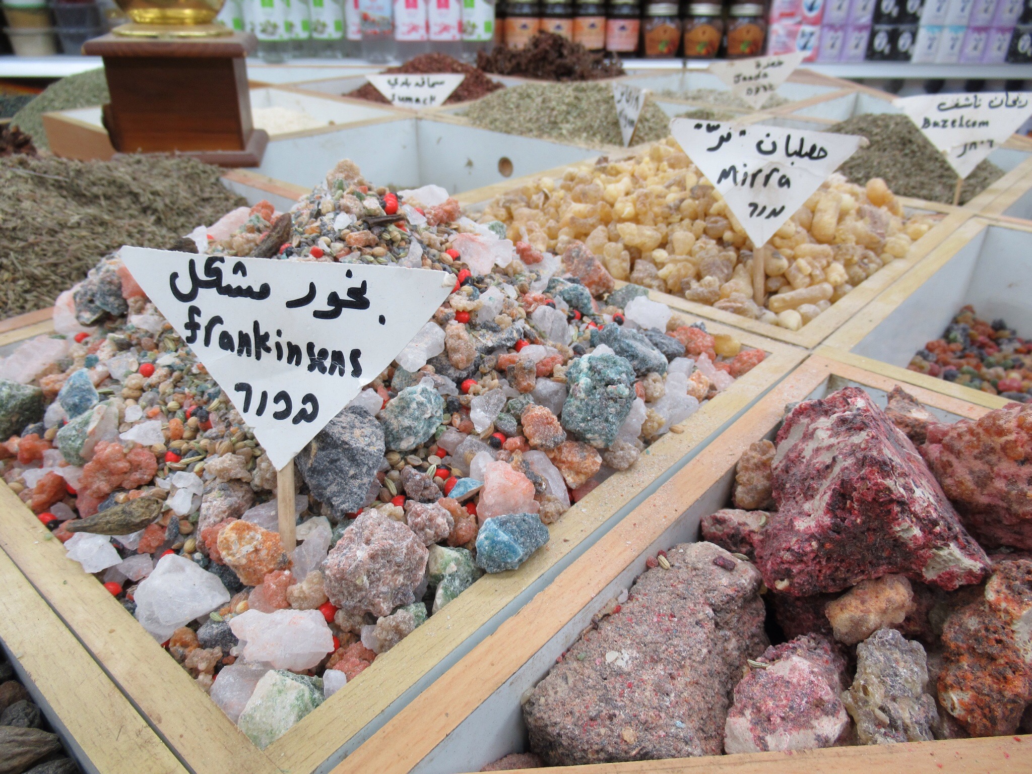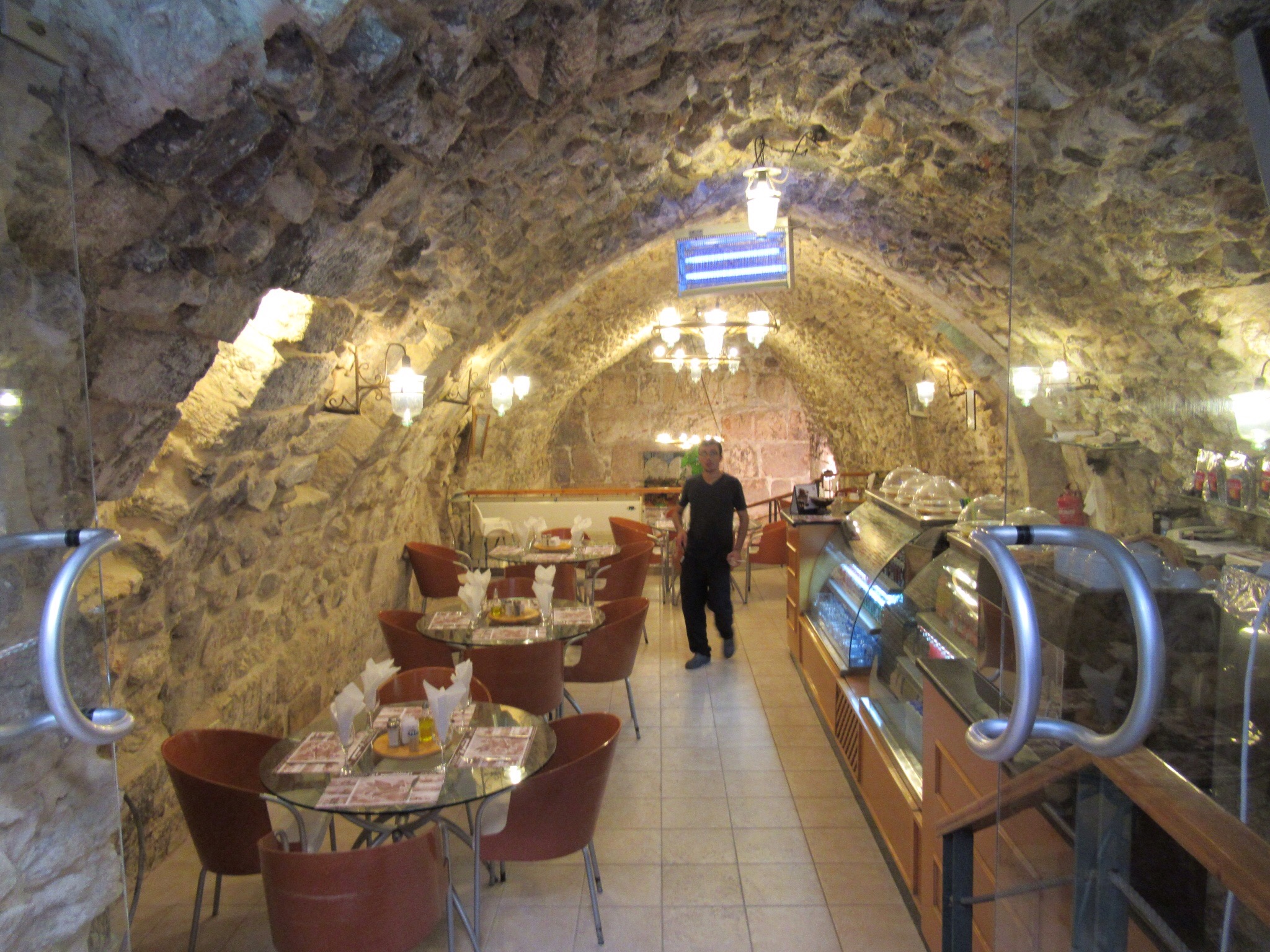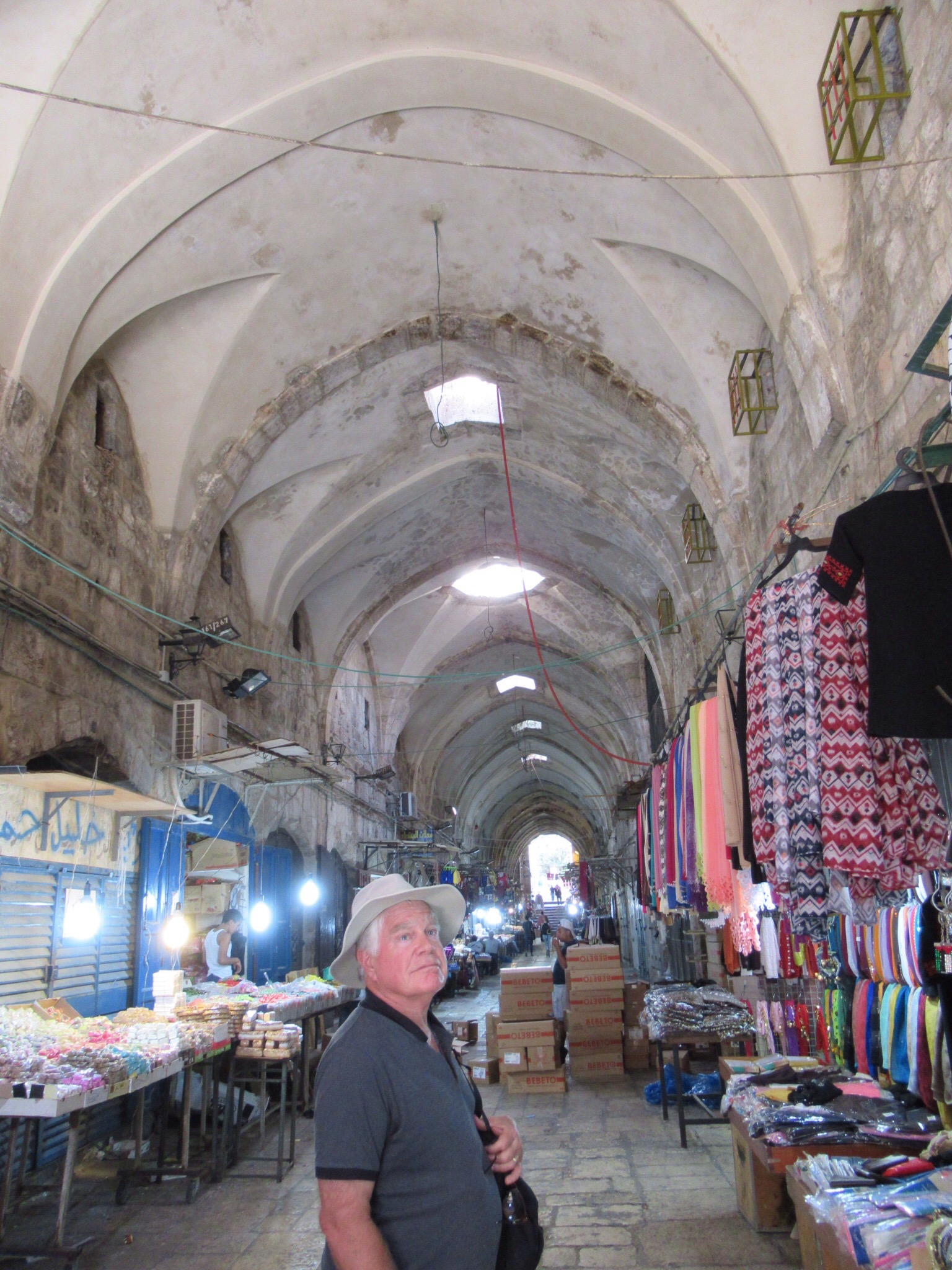 We returned to the hotel in the early afternoon. Peggy and I decided to return to the Old City and explore on our own. It is always an adventure to wander and get a little lost by just wandering down interesting looking streets. There are plenty like,that in the Old City of Jerusalem. There are also plenty of Isreali police and soldiers on almost every street. The people And the setting were amazingly interesting. The chance to see the myriad shops with their colorful and odiferous products was great. Mounds of spices, fruit, vegetables were mixed in with bakeries and meat markets. The partially butchered goats were a bit tough to look at with their weird furry tails on an otherwise skinned carcass. We made it out as the sum was setting with a few nice pieces of souvenir pottery.