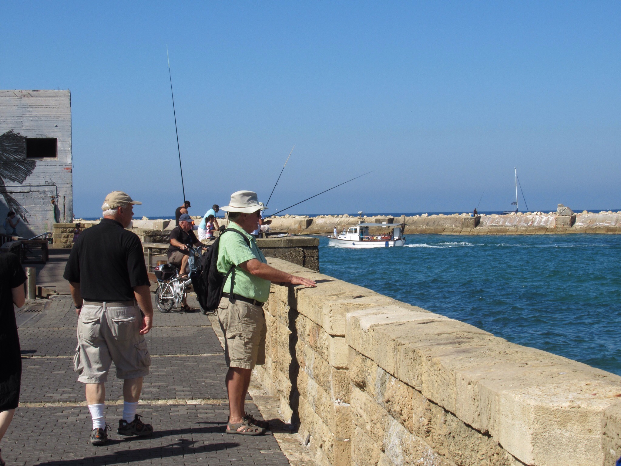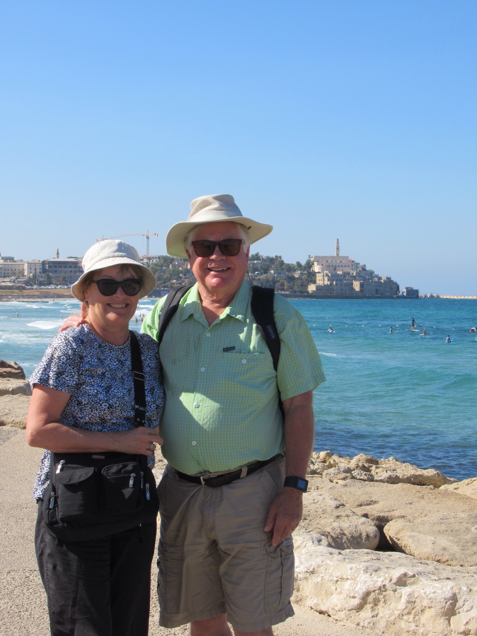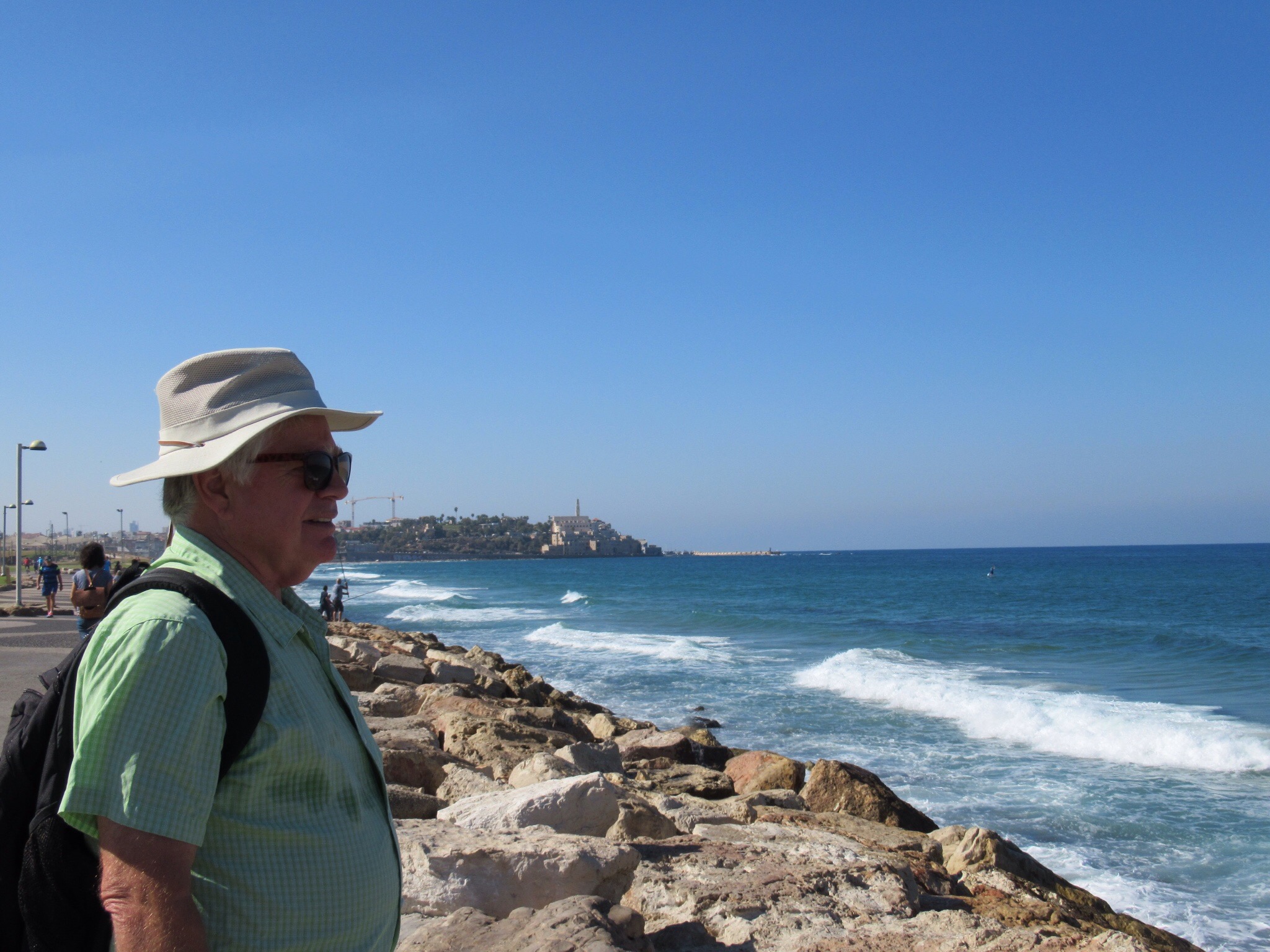 Enjoyed the chance to sleep in before beginning our daily adventure. We managed the gift of a bottle of Shabbat sweet wine with our breakfast. Too sweet for my taste but it was drunk in the spirit of the toast “Locheim” or “To Life”. Out the door and on the beachfront promenade for what turned out to be a three mile stroll along the sea to reach the ancient seaport of Jaffa or Yafo in Hebrew. Today is Shabbat, the day of rest, so most stores except those run by Christians and Muslims will be closed. Peggy and Audrey are still hopeful.