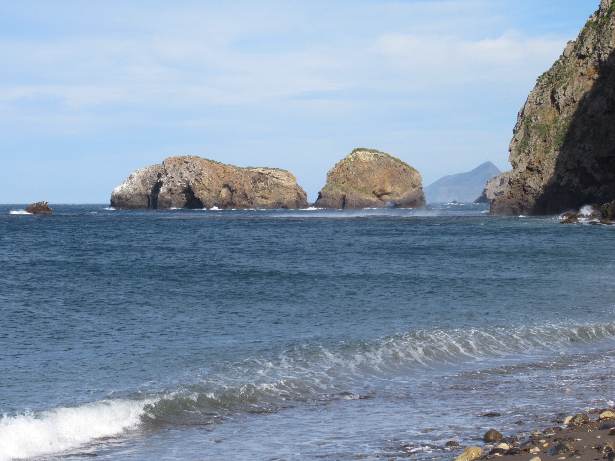 Getting to Santa Cruz Island meant a 20 mile boat ride. Because of high winds and seas, several boat trips were canceled. They launched a camper only boat and we climbed on. We joined around 30 high school kids heading to the more remote Santa Rosa Island. We sat down where the Rangers collected. The kids went to the bow and the top levels. We chose the stern and down low. As we left the harbor and hit the swells the kids shrieked with joy at the E ticket ride. Within 30 minutes, the same kids were lining the railing and feeding the fishes with their breakfast. We were fine by watching the horizon and a with little help from Dramamine for Peggy.