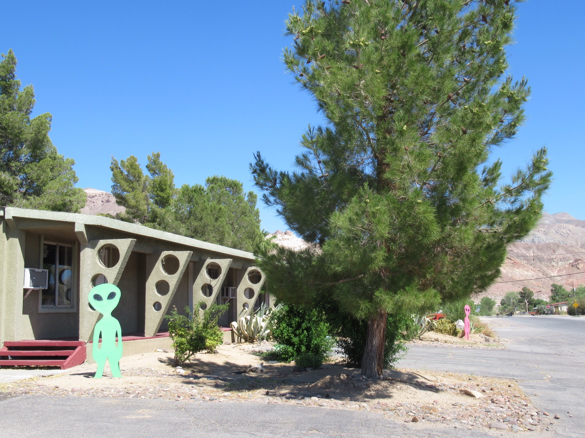 Checked into the Atomic Motel. We are sandwiched between Area 51 and Death Valley. It is 104 but the room AC is doing it’s job. The concierge also rescued us with a cork screw. Yes we brought one but lost it in the car last night because of the Bears. Anyway, all is well but I better start over.
