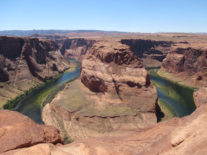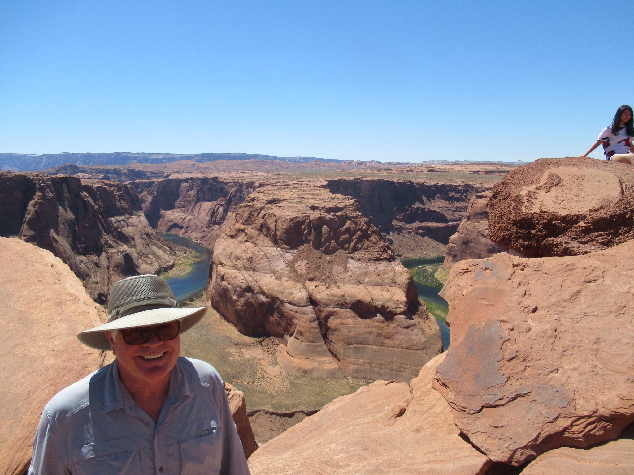 Back in the car and headed for Page some 120 miles away. Needed to cross the Colorado river near historic Lee’s Ferry. Beautiful masonry by the Depression era CCC. Since we were early for check-in, we decided to see the Horseshoe overlook downstream from the Glen Canyon Dam and Lake Powell. Plenty of tour buses that disgorged their contents onto a treeless, shade free plateau with numerous warnings about the extreme heat and the importance of water. It was 100 and with no cooling breeze. There were large numbers of Asian tourists. I didn’t see much evidence of water bottles. Nonetheless, no bodies were seen in the sand. We took it easy on the 3/4 mile hike and then back the same distance while climbing up and down. The real danger were the selfie sticks and posing on the cliffs. It was a long way down but fortunately no one made the quick trip. We stayed well back from the edge and lived to tell.
