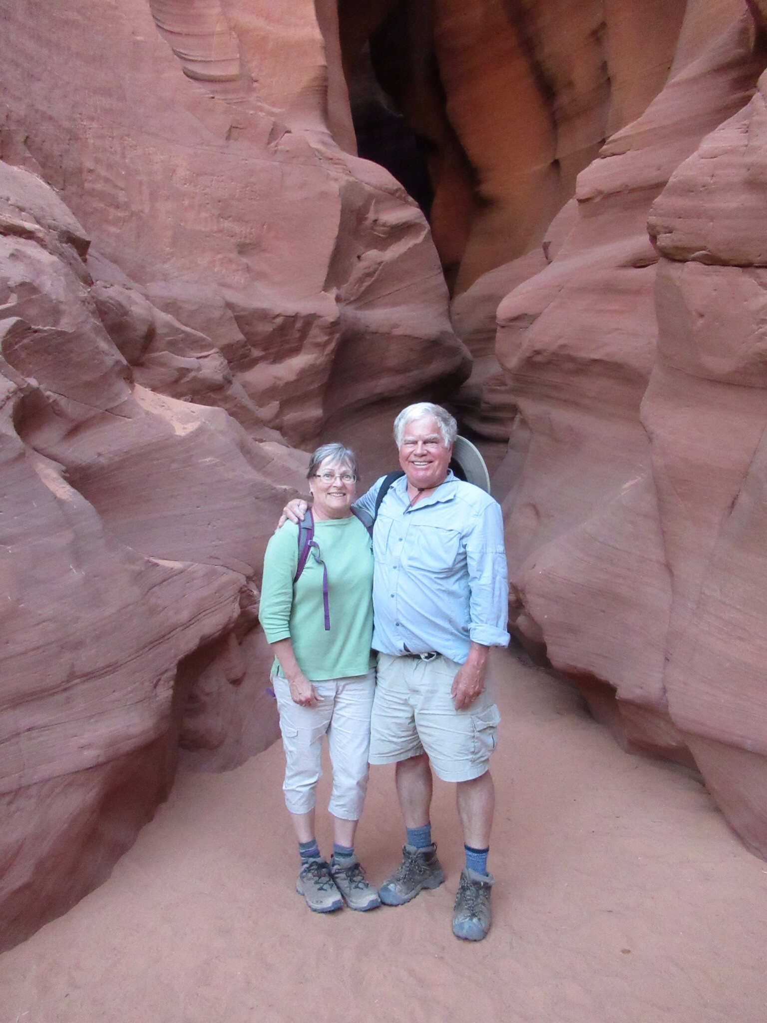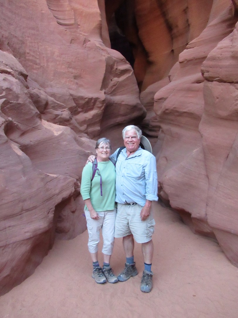 We headed off to our next adventure with the Navajo guide who escorted us and many others through the Antelope Slot Canyons. The canyons were created by flood waters that washed through the slot. The natural beauty of the place is unique. Despite the crowds and using our little travel camera, we were pleased with the surreal pictures. We will post a few. The ride to the canyon in the back of a bucking truck with 14 passengers was interesting. We traveled with a French lady from Nice. She approved of my last name.