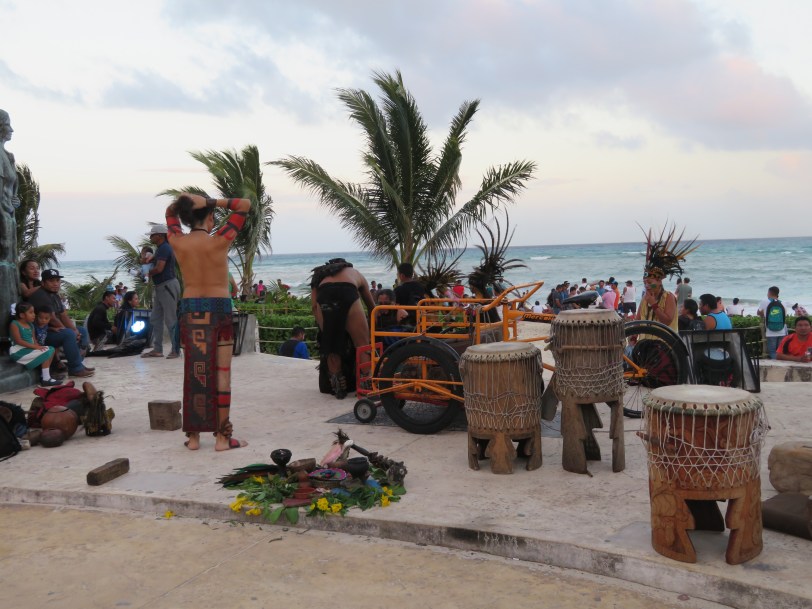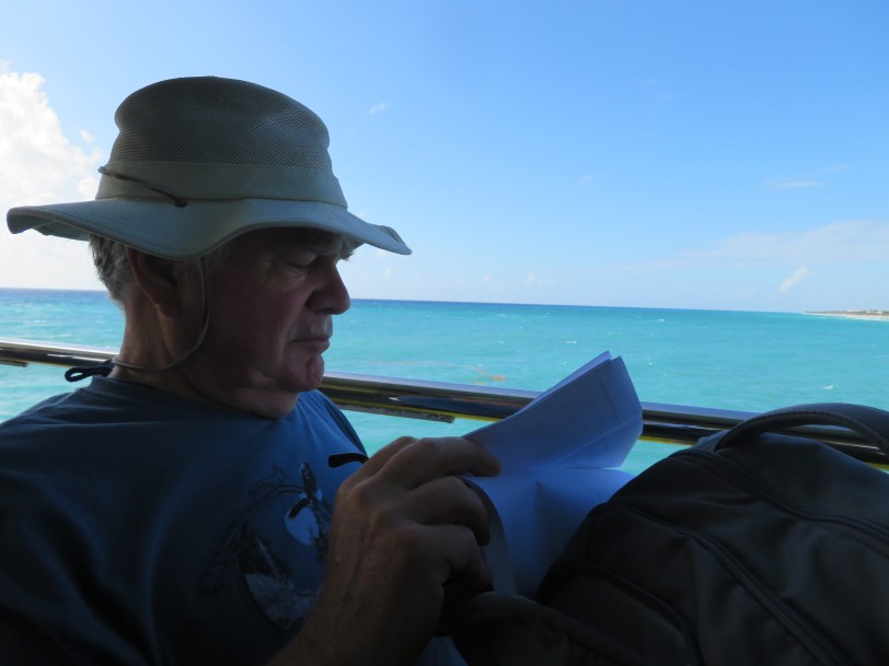 We went to another spot with less plentiful fish but it was OK. We finally boarded and received our reward of a weak beer and a ride back to the dock. We had to hurry to jump back on the ferry back to Playa del Carmen. The band going back was much better than the morning. We caught a Mayan trike-taxi back to the hotel and showered in time to meet our tour guide for the next three weeks. She was dropping off 15 or 16 folks who just finished what we will start tomorrow. They said it was fantastic. It will have to be smoother than adventure today.