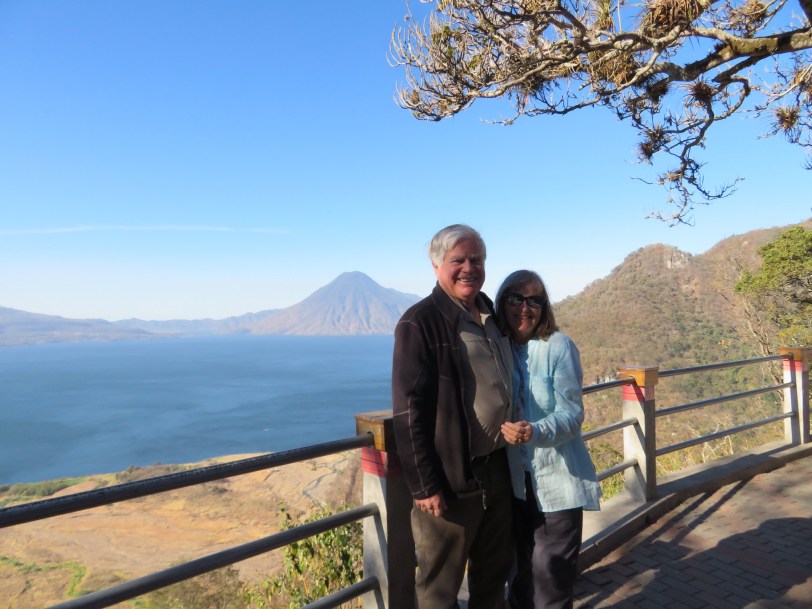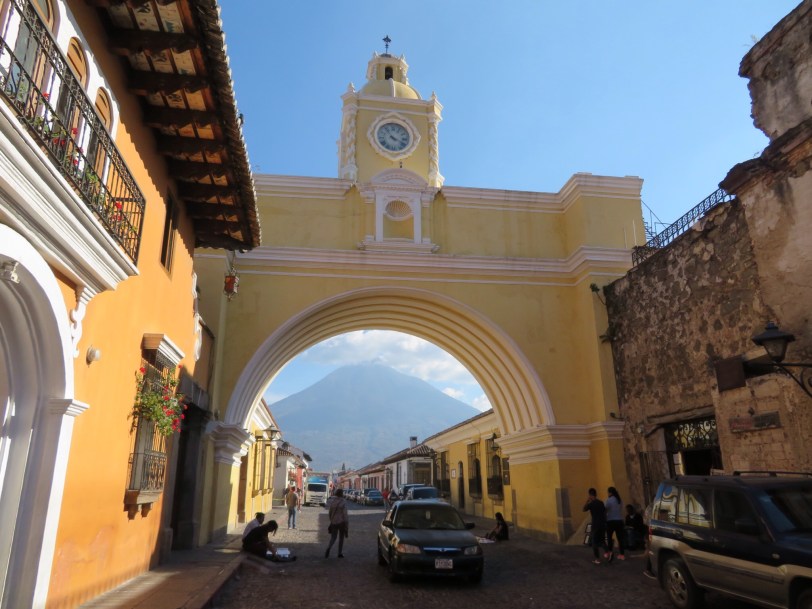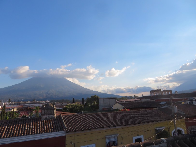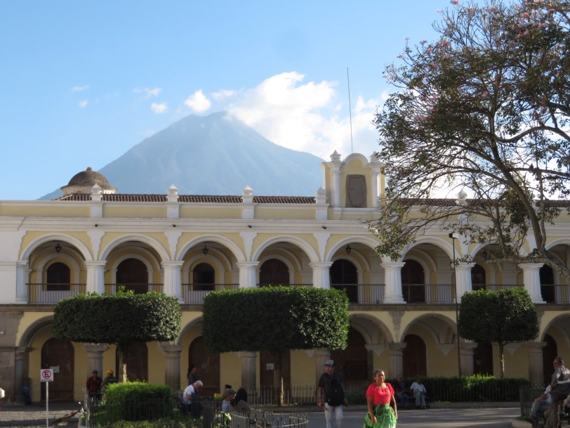 We arrived in Antigua in time for an orientation walk and unloading our laundry at a service for pick up tomorrow. We will spend the full day here tomorrow on our own. We did manage to find the Antigua Brewery and watch the sun go down while watching the wrong volcano. Half way through our excellent hamburger, we were directed to “El Fuego” that was puffing smoke. It was finally too cold to watch. Antigua is at around 6,000 feet and definitely a locale for sweater night time wear. We are in a charming small hotel and liking our room.