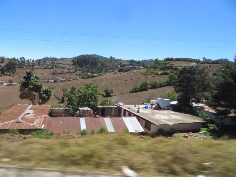 We were back on the van for our remaining ride to Antigua. Tried to capture a few pictures of Guatemalan farms. The ones in the hills manage to grow crops on the sides of hills that we would find daunting to climb. In the rare flat areas, the vegetables and other crops are grown intensely. Didn’t see much in the way of tractors or heavy farm equipment. Still they manage to grow enough food to feed this country of 17 million and produce export crops. Of course, the scales weigh against the poor but the land seems to be peaceful from the perspective of a traveler.