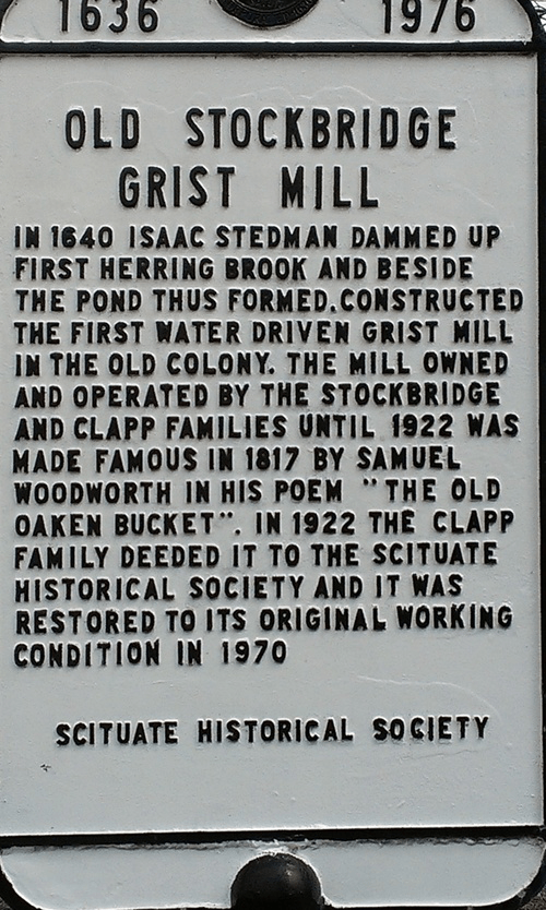 Samuel Clapp will live his life in Scituate marrying Hannah Gill in 1666. Following the merger of the Massachusetts and Plymouth colonies, Samuel will be a Representative to the General Court almost continuously from 1692 until 1715. Previously he had been a Deputy to the Government of the Plymouth Colony. His prosperity originated with the acquisition of the family farm as well as ownership a grist and saw mill where the Stockbridge Mills have since stood (the Clapp and Stockbridge families will continue to own and operate the mill until 1922. It was restored in 1970. He held the probably honorific title of Major despite no recorded evidence of a military role. Wife Hannah Gill was born to an early Hingham Thomas Gill in 1645. Among their numerous children is Joseph born in Scituate in 1668. Joseph lived on Black Pond Hill where he had land. Unlike most of his family, Joseph will look outside of Scituate finding Abigail Allen of Braintree in 1695 at the age of 27. The marriage will still produce 12 children despite the late start. Ancestor Benjamin Clapp is born in 1710 in Scituate and will live until 1773 with wife Grace Turner. The Turner family had resided in Scituate since 1633 with the arrival of Humphrey Turner. Humphrey had been dismissed from membership in the church in Plymouth on the condition that they ‘join in a body in Scituate”. Humphrey was a tanner by trade and builds the sixth house in Scituate on the fourth lot allowed on the Satuit (Scituate) brook. He also had a farm on the Driftway near Coleman Hills.  He was also one of the seventeen organizers of the first Scituate Church in 1634/5. We know little of Benjamin’s life other than he probably was involved in some of the family tanning business. Their son, Benjamin Jr. will be born in 1737 and marries Deborah Nash in 1758 and produce ancestor Rachel Clapp in 1755. Rachel will marry Lawrence Litchfield in 1777 just as the Revolutionary War is upon the colony.